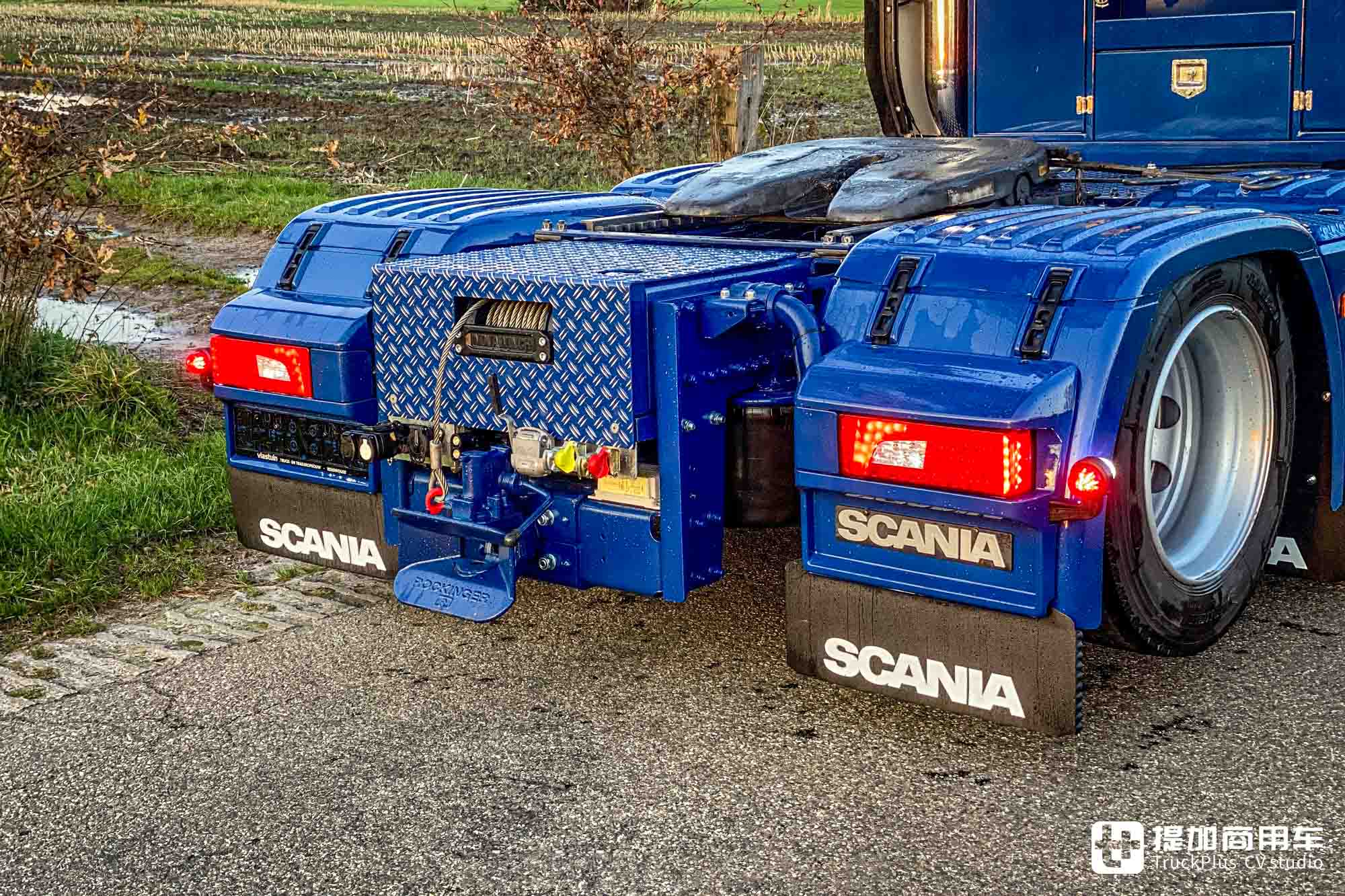 车身涂装采用了其车主:Müller European Truck & Trailercare Holten公司的标志性设计,主打一个蓝白拼色碰撞。其中车辆驾驶室采用白色车漆,底盘部分采用蓝色车漆,并为轴头、格栅内部等地覆上了蓝漆。再加公司的相关拉花,整体视觉效果简约耐看。