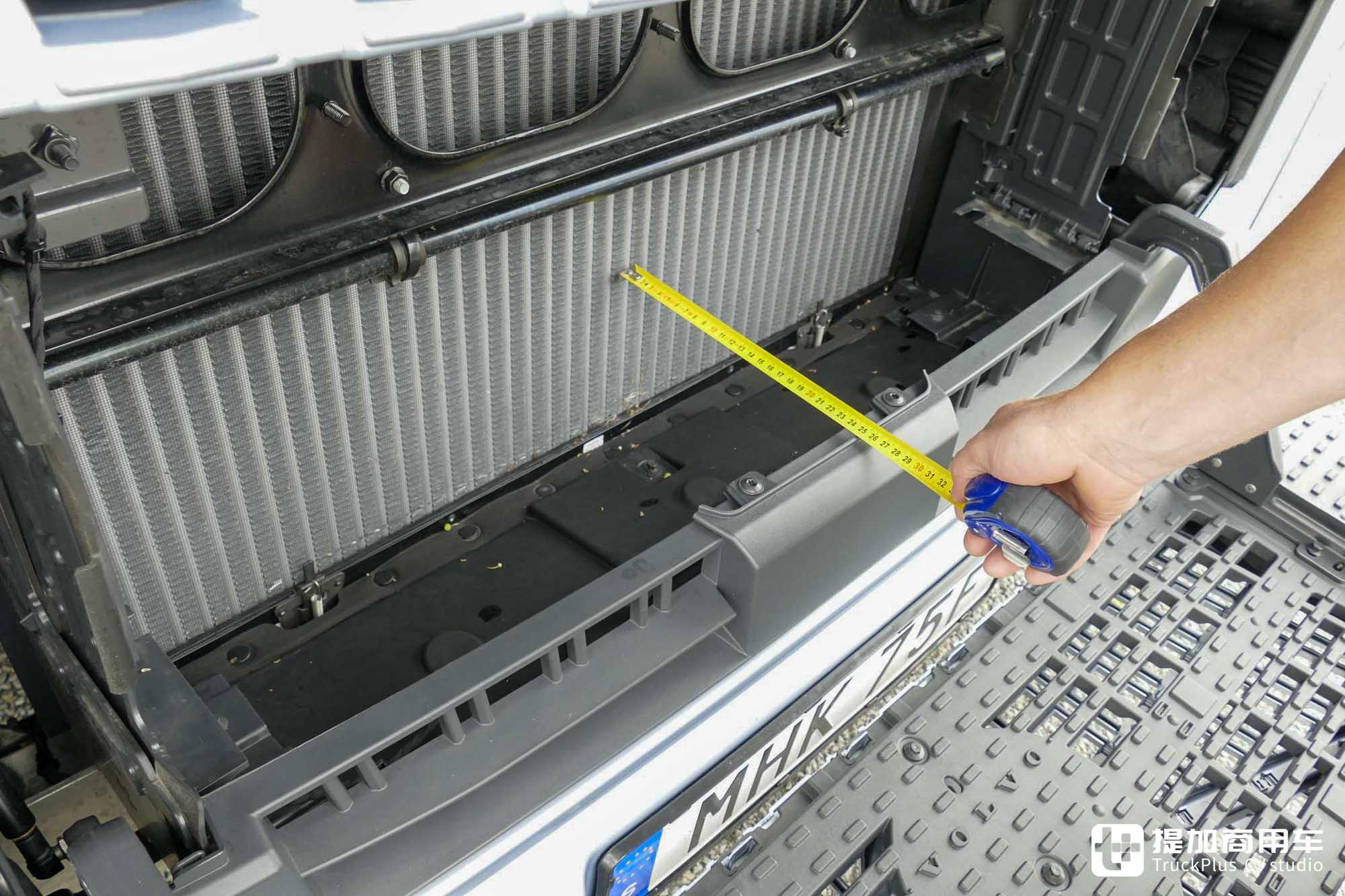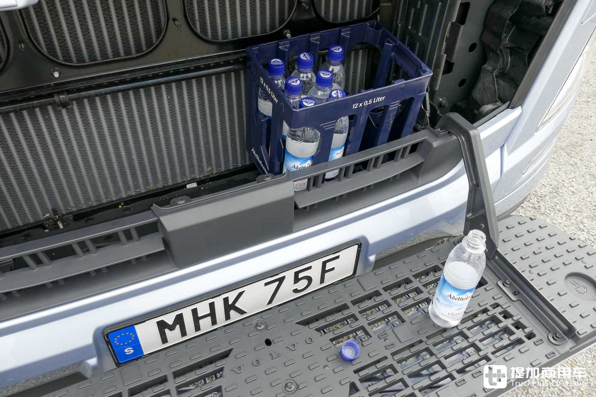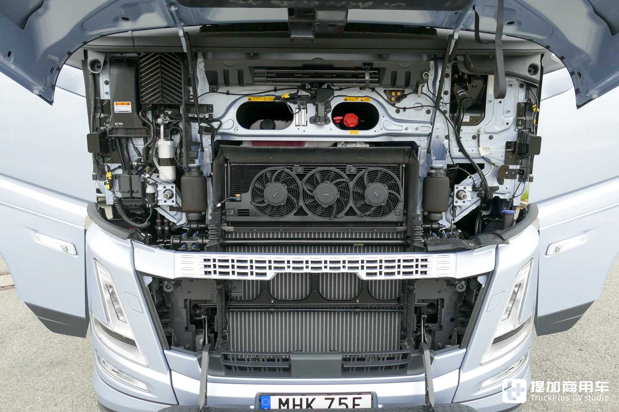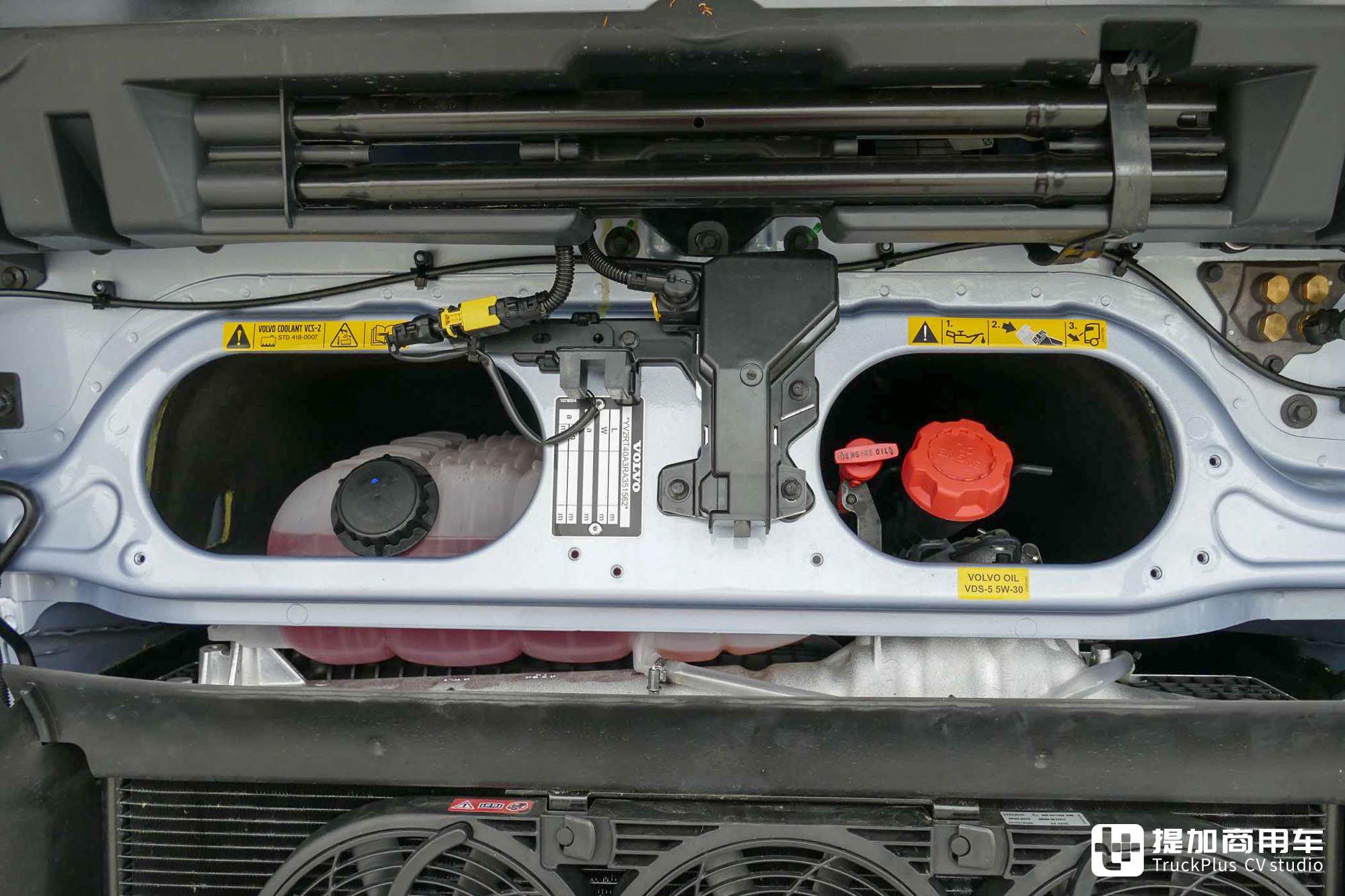 前脸与后方散热水箱之间留有不少的空间,宽度容纳一提水没什么问题。这代表着:FH Aero系列车型和普通版FH车型在车身架构上还是有很多相似之处、通用的零部件更多,这有助于降低车辆开发及购置成本,维修保养也更方便、更便宜。