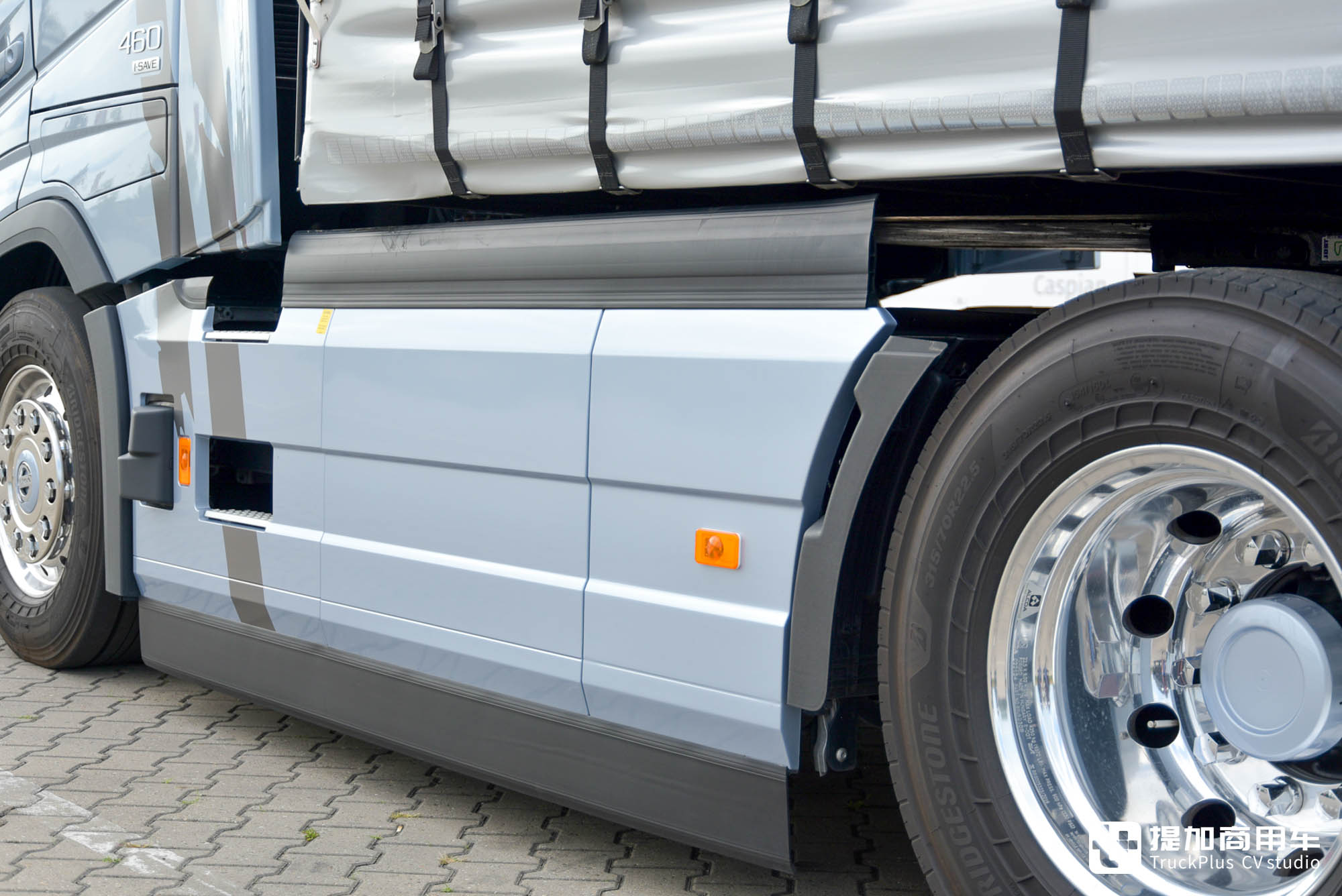 除了电子后视镜外,沃尔沃FH Aero还设计了原厂侧裙,上下带有黑色软质橡胶片,进一步填补车身空隙、避免空气乱流涌入,从而降低空气阻力及噪音、改善行车稳定性,同时也带来了更饱满、更整齐的外观效果。