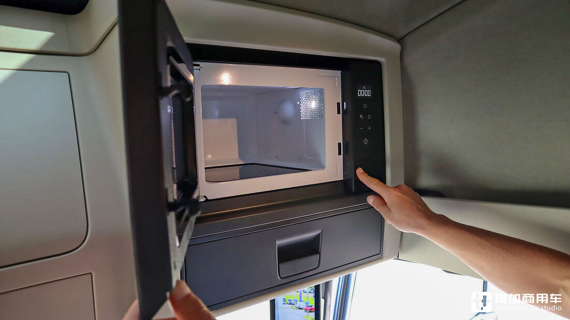 有了冰箱,那随车微波炉自然也不能缺席。它放置在车顶储物吊柜内部,与吊柜合二为一,通过原厂提供的逆变器供电,行车在外也能轻松吃上热饭。除此之外,沃尔沃FH Aero还可选装随车咖啡机,帮助驾驶者时刻保持清醒。