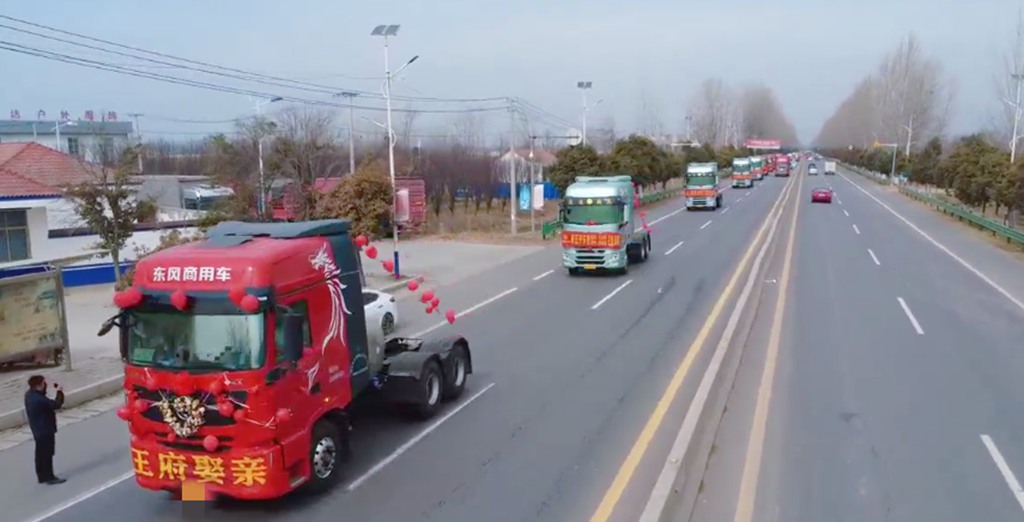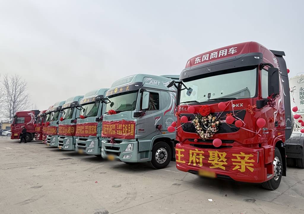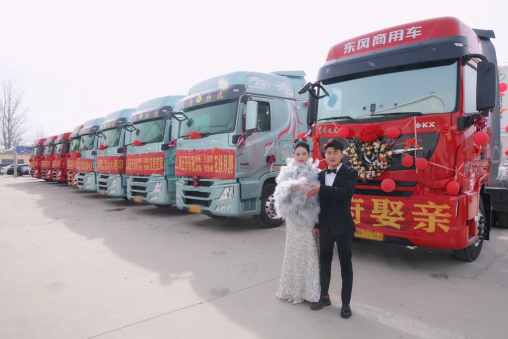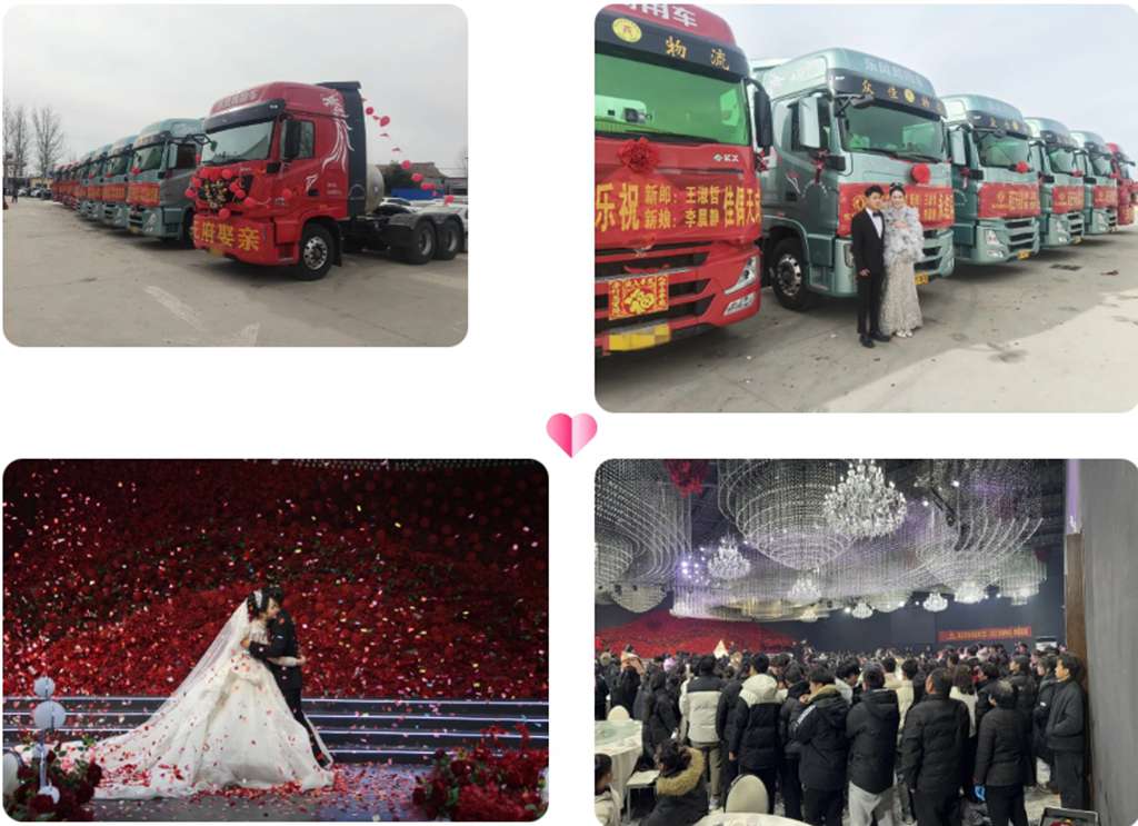 这场婚礼的新郎父亲王涛,作为东风商用车的领袖客户,他的车队主要往返于江苏—— 新疆这条运输航线大动脉。从 2023 年至今,他的车队陆续采购了 35 台东风燃气车,这些车辆凭借卓越的性能,在长途运输中表现出色,不仅高效完成运输任务,还以良好的经济性为车队降低了运营成本。如今,王涛正在考虑为车队引进 630 马力的东风燃气车,进一步提升车队的竞争力。