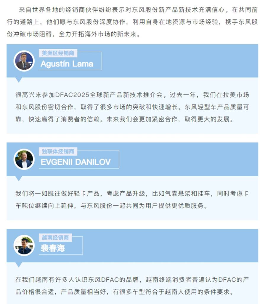 非洲和美洲的优秀经销商代表作了经验分享,他们讲述了与东风共成长的故事,表示对东风股份展示的新技术和未来规划充满信心。