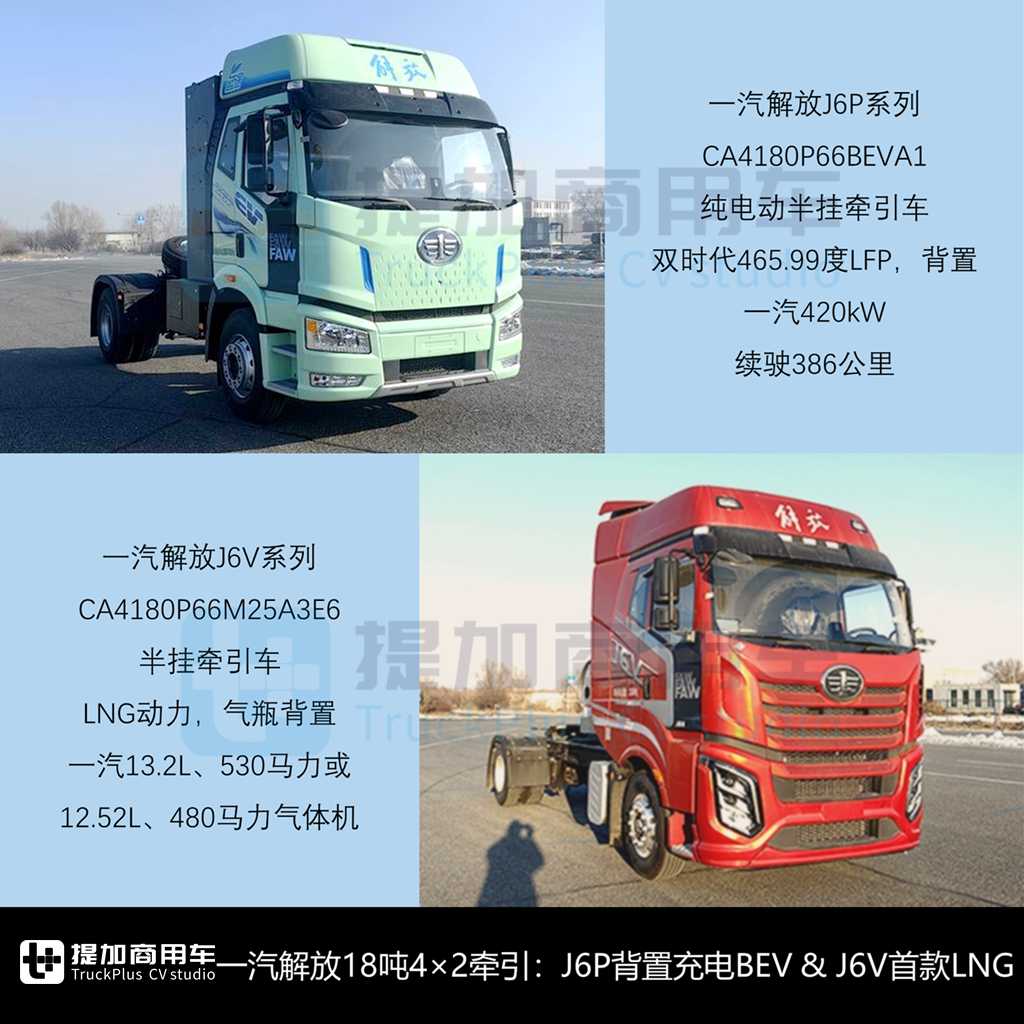 - 另款为一汽解放J6V系列CA4180P66M25A3E6半挂牵引车,LNG动力,气瓶背置方案、数量可选,准乘2/3人,轴距5.2/5.4米,可选两组板簧或后空气悬挂,准拖33吨挂车,匹配一汽13.2L、530马力或12.52L、480马力气体机,最高120或限速89km/h。该车为解放J6V系列4×2的首款LNG车型,目前已有J7、J6P、JH6/鹰途、JK6和JH5(新/老款)共计16款同类车型可选,产品线完整、配置丰富。