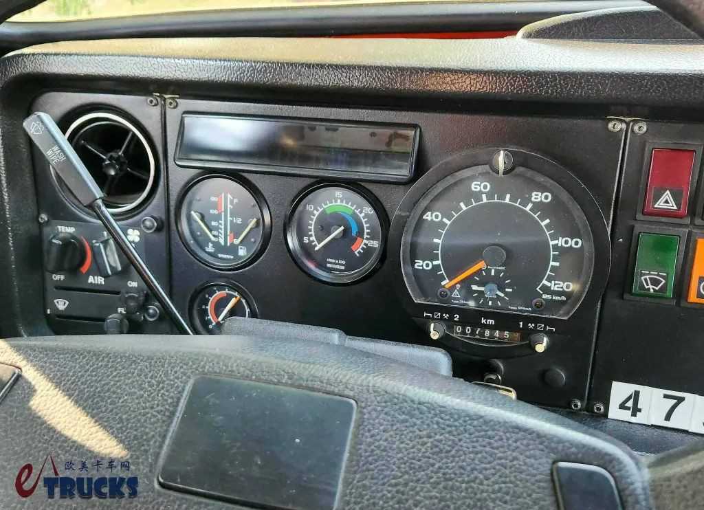 仪表盘由多枚机械仪表组成,分别显示了水温、油量、发动机转速、车速等等。车速表下方带有里程统计,截至2024年9月时,车辆行驶里程仅为7845公里。即便考虑到待命、出勤时的原地运行工况,也可以说:这台沃尔沃NL10长头消防车似乎正值壮年。