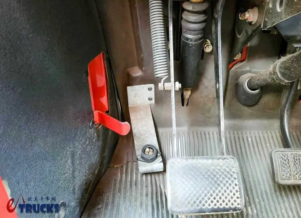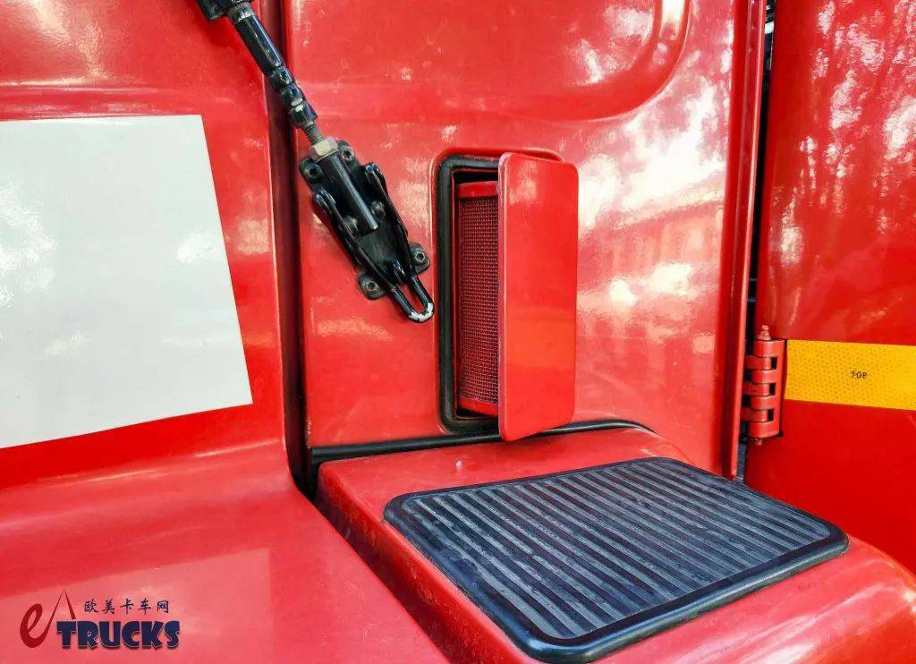 不同于平头卡车的登车踏板布局,长头卡车的前桥位于踏板前方,因此踏板需要和底盘附件共用空间。在这台NL 10长头消防车上,车辆登车踏板同刹车储气筒、柴油箱“融为一体”,外侧附加黄红色警告条纹。最下一级登车踏板为活动式,不会对车辆离地间隙造成影响、磕碰时不易损坏,兼顾了登车便利性及通过性。