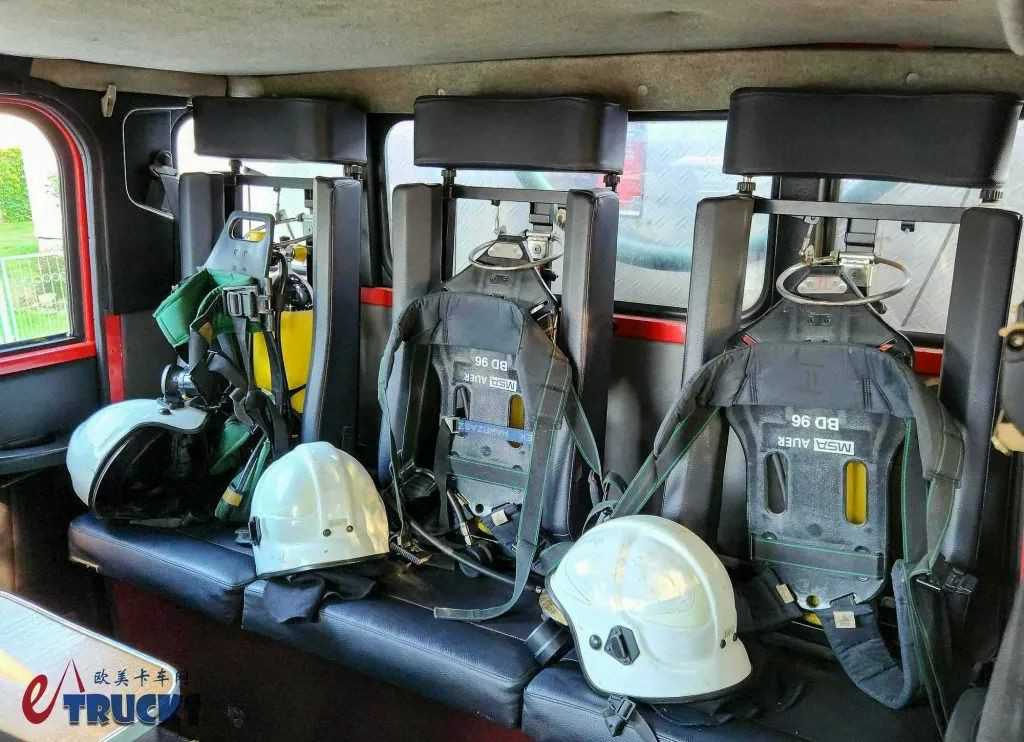 车辆后排设计有三张座椅,它们的靠背采用特殊结构,可容纳空气呼吸器等设备,便于消防员穿脱装备