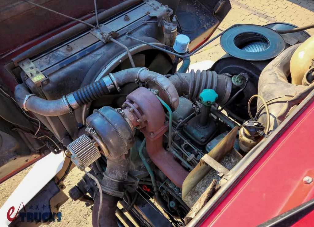 掀开引擎盖,车辆的发动机便映入眼帘。这台沃尔沃NL10长头消防车搭载了TD10系列柴油发动机,直列六缸结构、排量9.6升,采用增压中冷技术,能够输出318匹马力,匹配8速手动变速箱。得益于其强大的动力及可靠性,这套动力在当年的欧洲跨国运输中极受欢迎,至今仍能获取到备件,也是本车尚未退役的原因之一。
