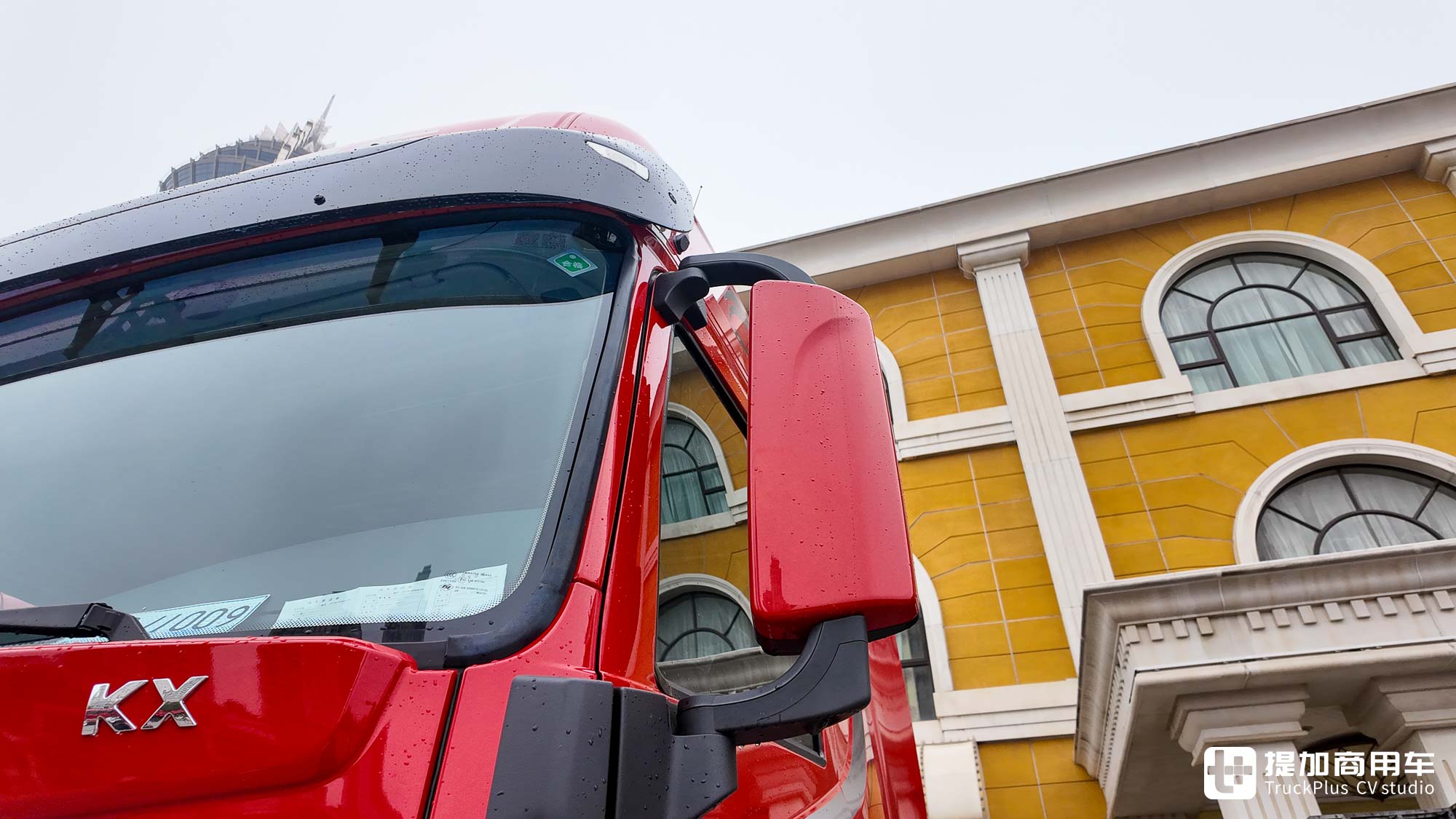 用于说明车系的KX标识位于前风挡右下方,而经典的东风天龙字标则位于前风挡左下方
