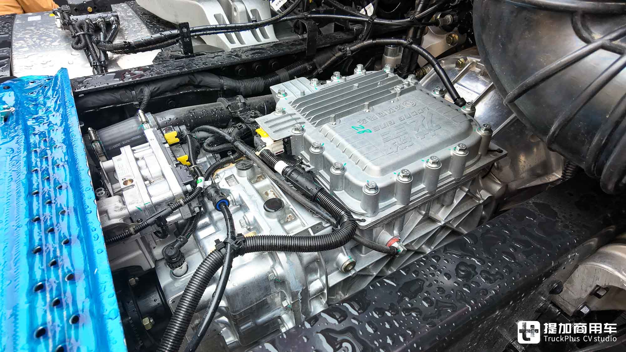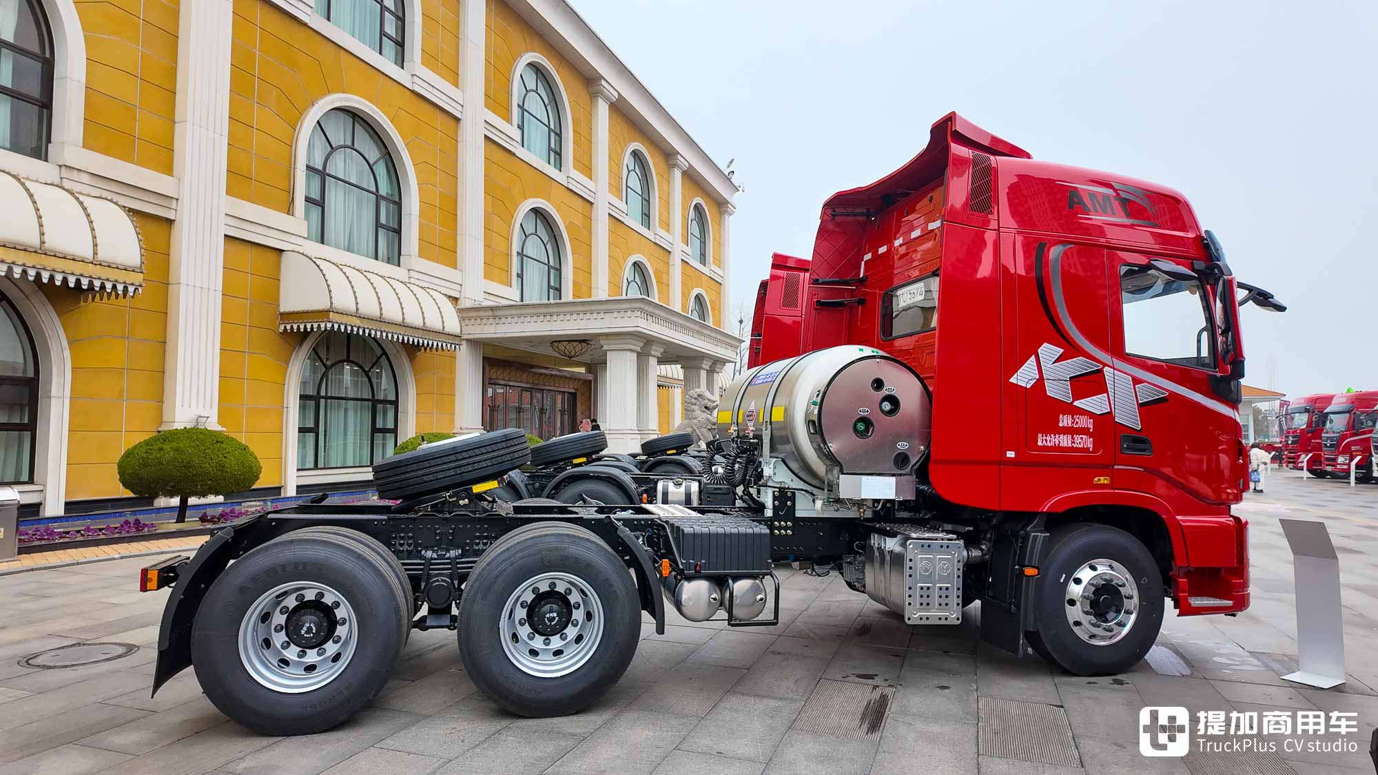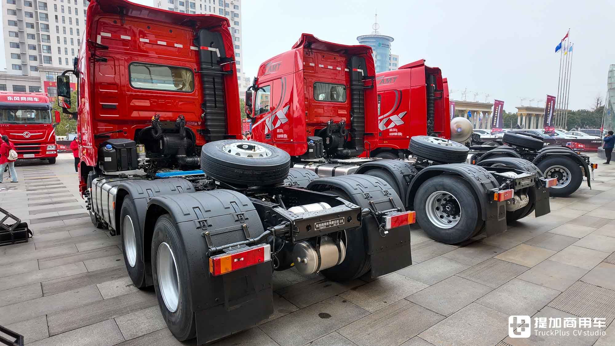 在发布会现场,东风还展出了天龙KX新嵘耀天然气牵引车,采用6x4的驱动形式,LNG液罐为背驼式结构,安装于驾驶室后侧。它搭载全新一代龙擎3.0天然气发动机:DGi13T520,输出520匹马力及5400牛米扭矩,结合新一代DF400高效节能桥、龙擎DA12/DT14变速箱。高传动效率及承载能力是其优势,气耗优于行业水平5%-7%。