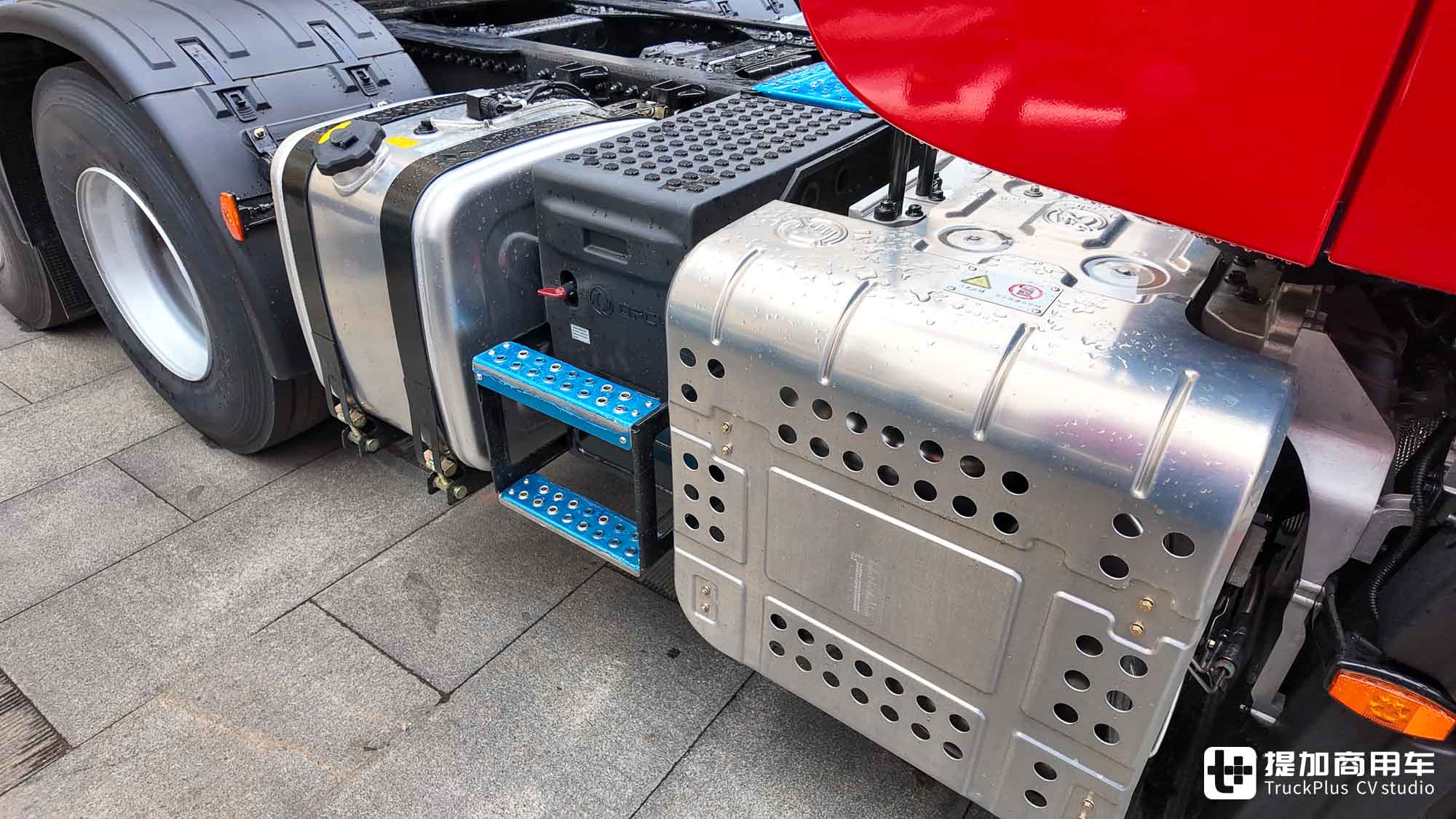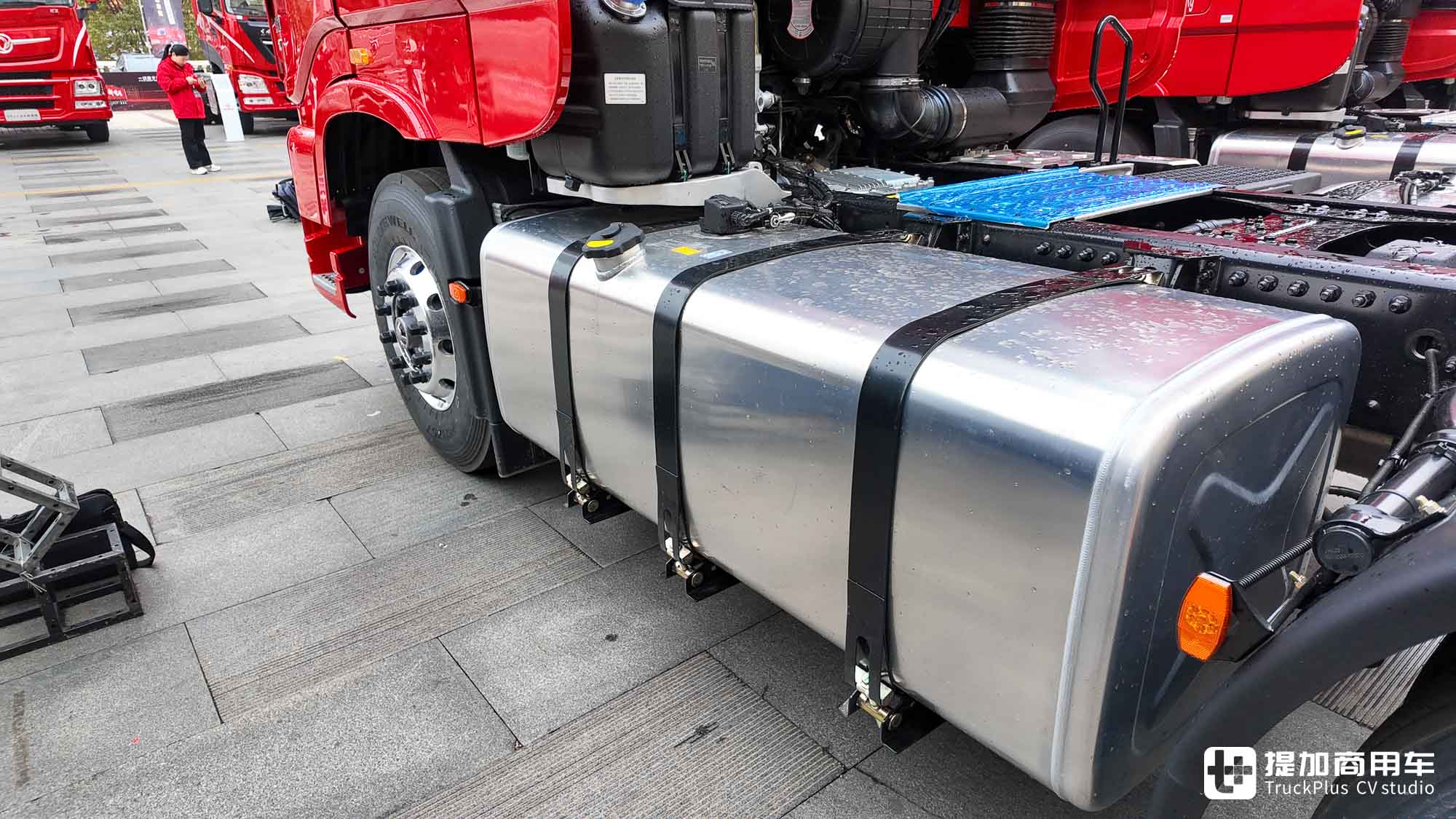 发布会现场展出的东风天龙KX新嵘耀车型均搭载东风龙擎3.0动力链,上图为其中的柴油牵引车。为了尽可能提升续航能力,车辆在底盘左侧搭载了大容积的轻量化铝合金油箱