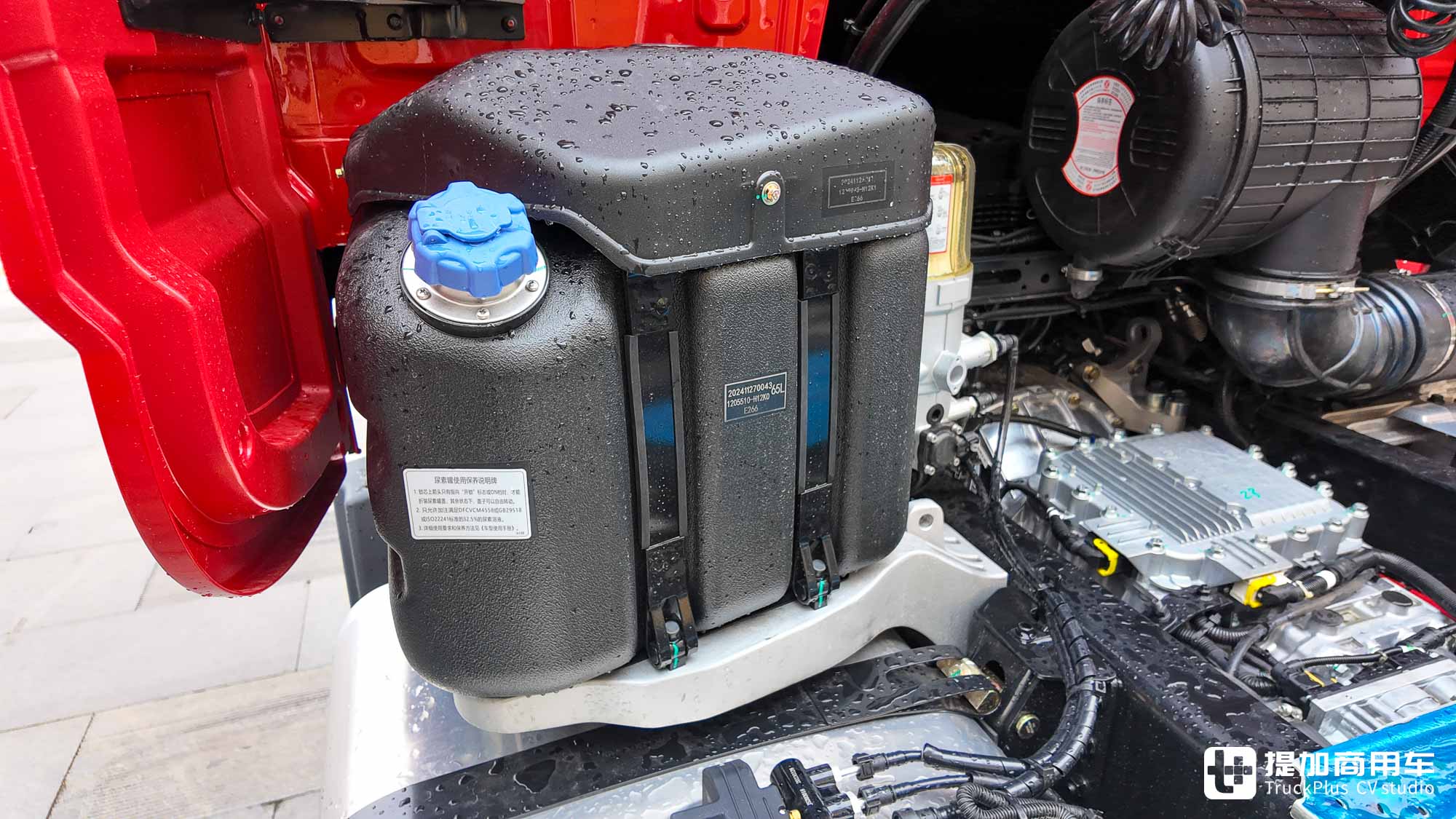 由于底盘两侧油箱等设施的存在,尿素液罐便被移至了驾驶室左后方安放