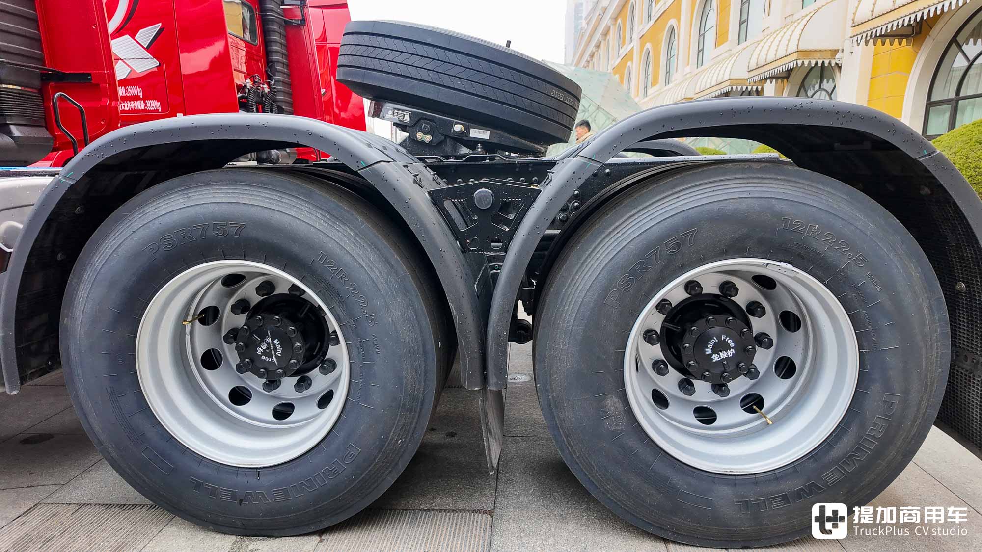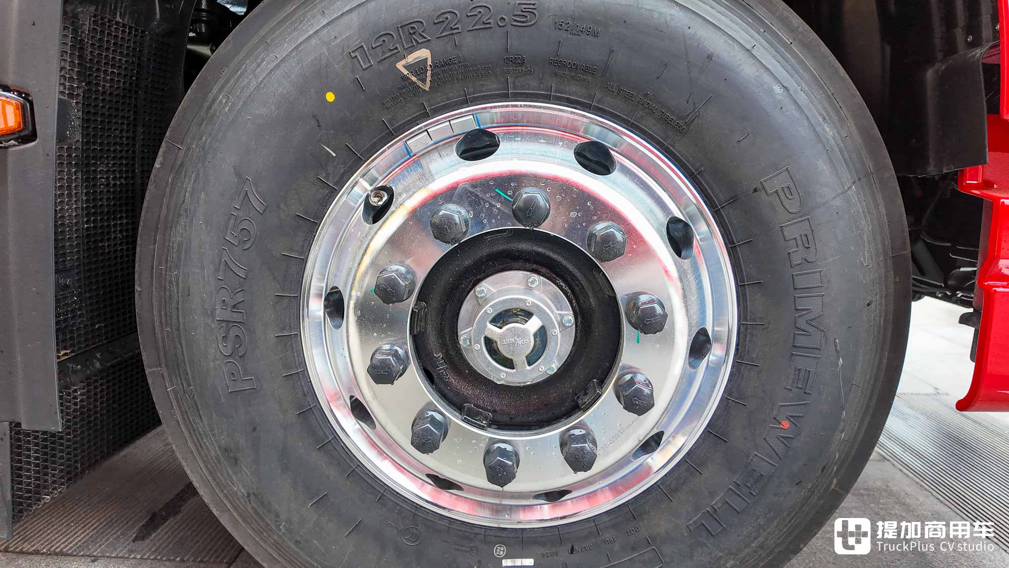 前桥为康迈油润滑轮端+铝合金轮圈。相较脂润滑轮端而言,康迈油润滑轮端具备良好的润滑性能和散热性能,能够降低轮端过热而引发的车辆故障的概率,还可通过透明端盖来一目了然的观察内部油液情况,提高运输便利性及可靠性。