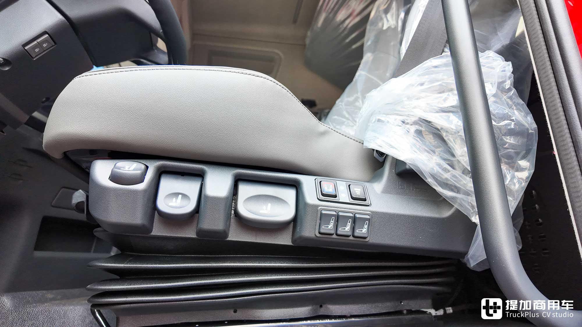 座椅是驾驶员在运输过程中最长打交道的配置,东风天龙KX新嵘耀在这点上也做的不错。车辆采用了伊思灵华泰NTS870座椅,是伊思灵NTS 系列的明星产品之一。这款产品拥有优秀的人体工程学设计,不仅提供了四向气囊腰托,还增加了肩部支撑结构,从而降低长途驾驶过程中的疲劳感。