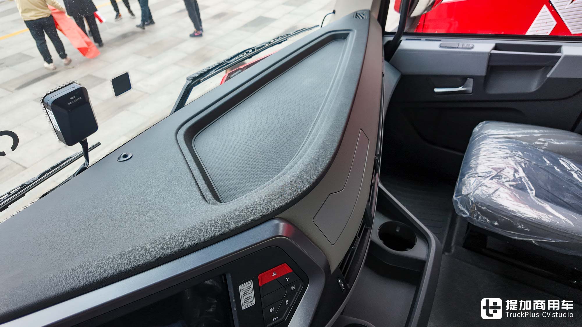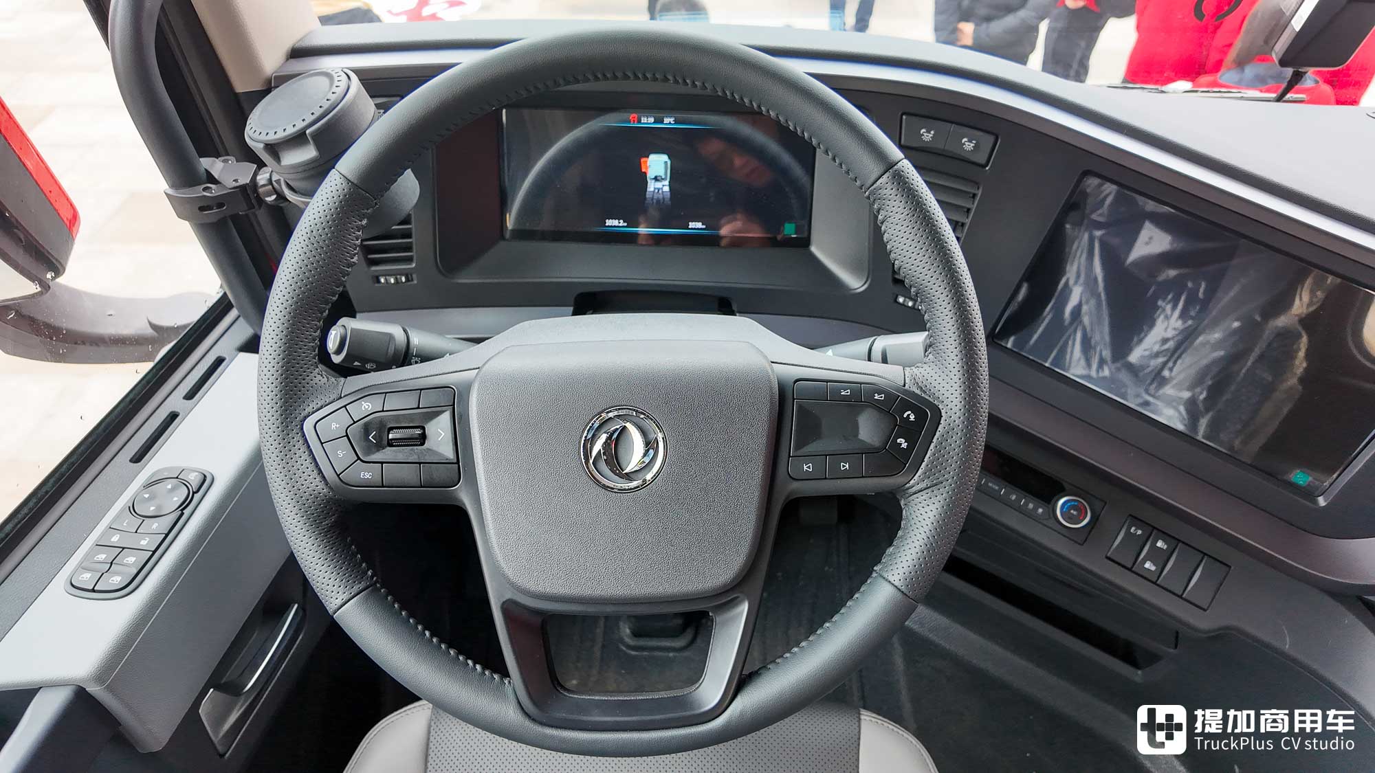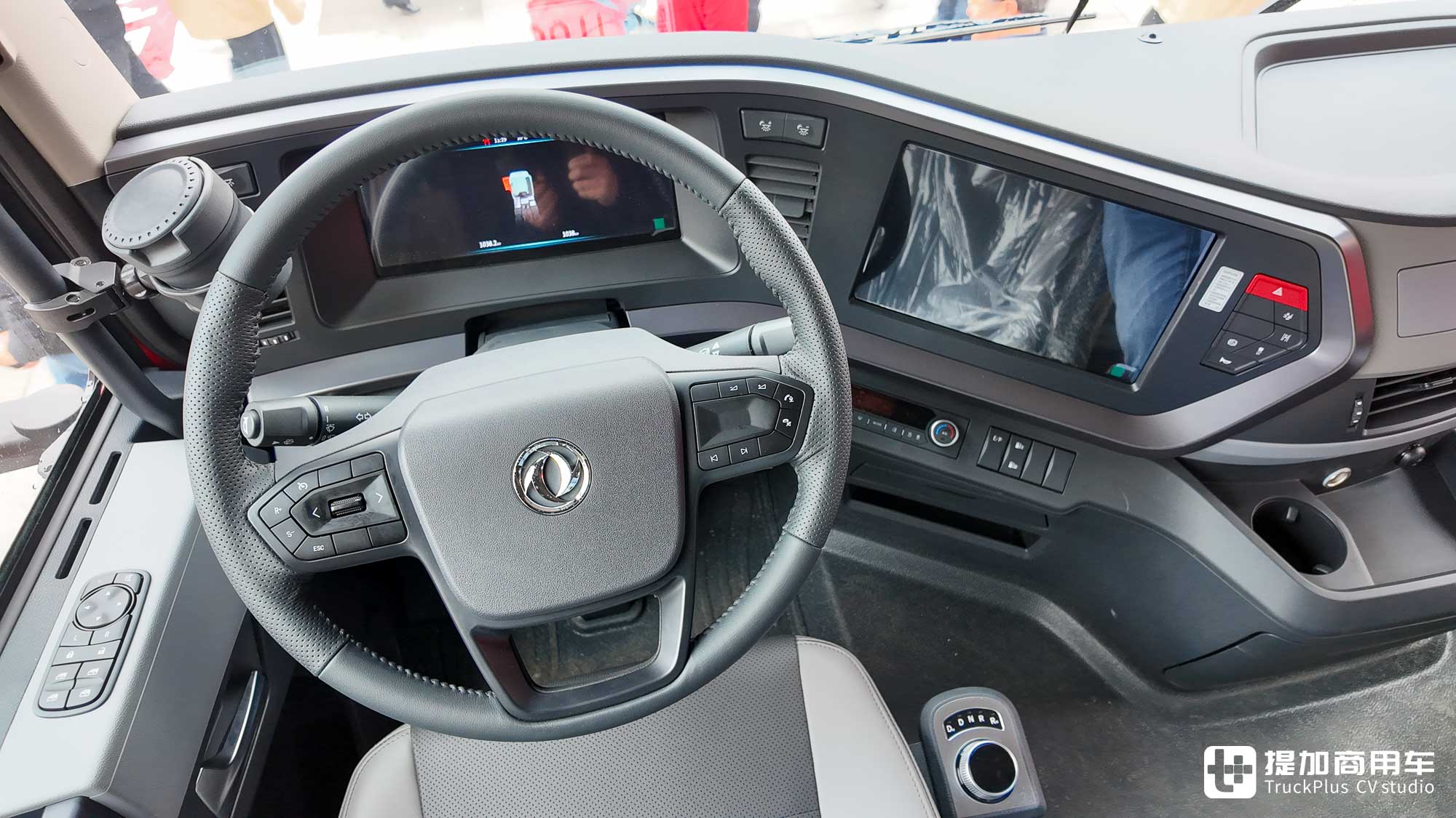 东风天龙KX新嵘耀采用了内嵌式多媒体座舱,由12.3英寸全液晶仪表盘+12.8英寸多媒体屏幕组成,采用一目了然的触摸式操作,集成多种功能,最终塑造出简洁的仪表台造型。绝大部分操作功能都能够通过语音来控制,使用便利度及安全性是十分到位的。