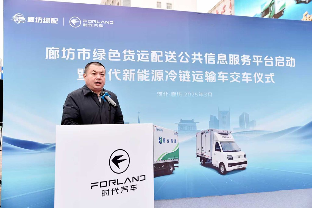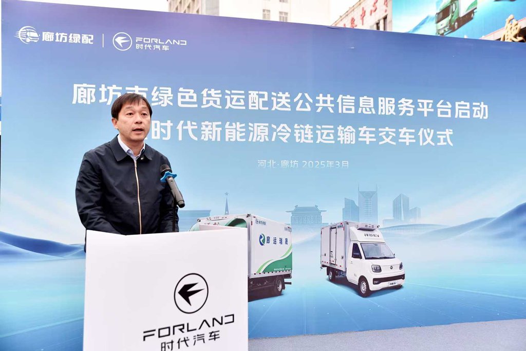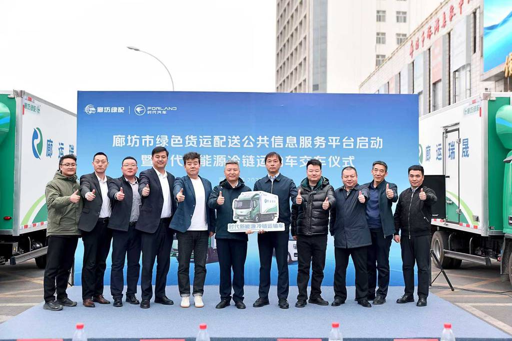 3月14日,廊坊市绿色货运配送公共信息服务平台启动暨时代新能源冷链运输车交车仪式在河北廊坊顺利举行。廊坊市运输事业发展中心党总支书记陈帅,廊坊市交通运输局综合运输科科长蔡辉,廊坊交通运输集团有限公司党委副书记、总经理张存伯,廊运集团瑞晟城市服务有限公司经理周航,北汽福田副总裁、时代事业部党委书记、总裁刘旭光,北汽福田时代事业部营销副总裁刘刚,廊坊宏睿盛世汽车贸易有限公司总经理王刚等领导及嘉宾出席活动,共同见证时代新能源冷链运输车首批交付廊运集团,助力廊坊市打造城市绿色货运配送示范工程,同时标志着廊坊在贯彻国家“双碳”战略、构建绿色物流领域迈出坚实的一步。