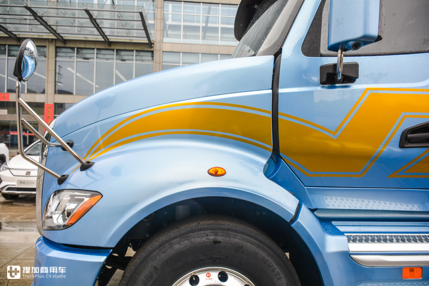 车辆的宽度也是从前到后递增的设计,前面“鼻子”宽度窄,过了驾驶位之后宽度明显变大,保证卧铺的尺寸。这也是美国长头卡车的设计风格,驾驶室内前窄后宽。