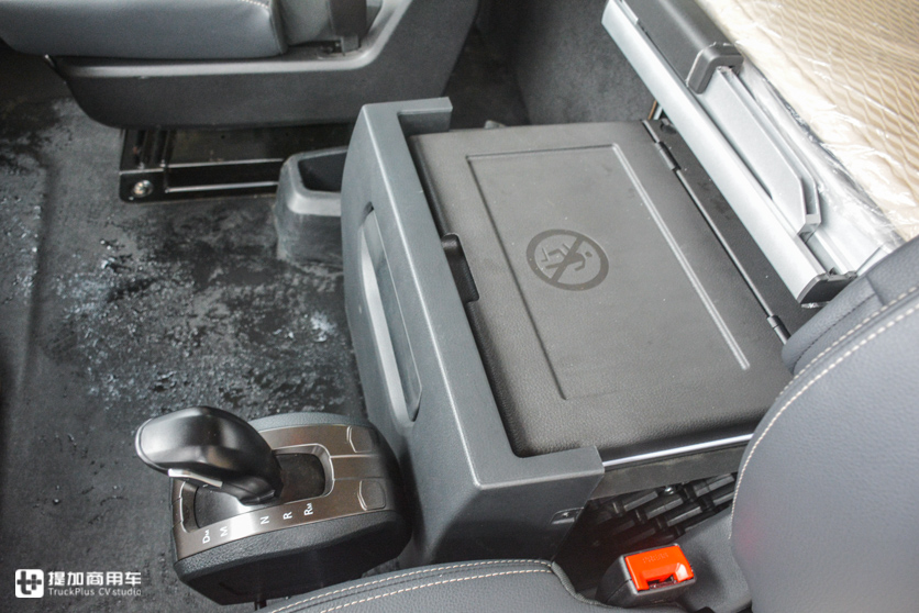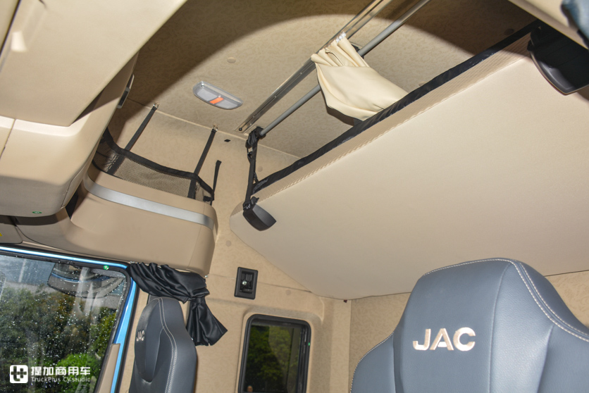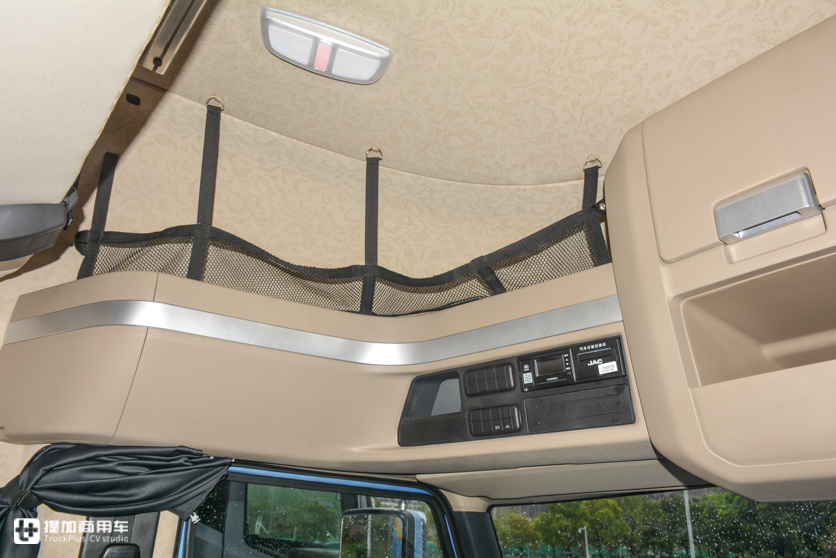 V7车内顶部储物空间为“U”型布局,受限于顶部外形设计,只有中间有一个容积比较小的储物箱。左右两侧的弧形造型导致只能做出储物格,用网兜来防止存放的物品掉落,这样的设计一定程度上会影响很多物品的存放,顶部可用的储物空间就少了。这一点是比平头卡车劣势的地方。