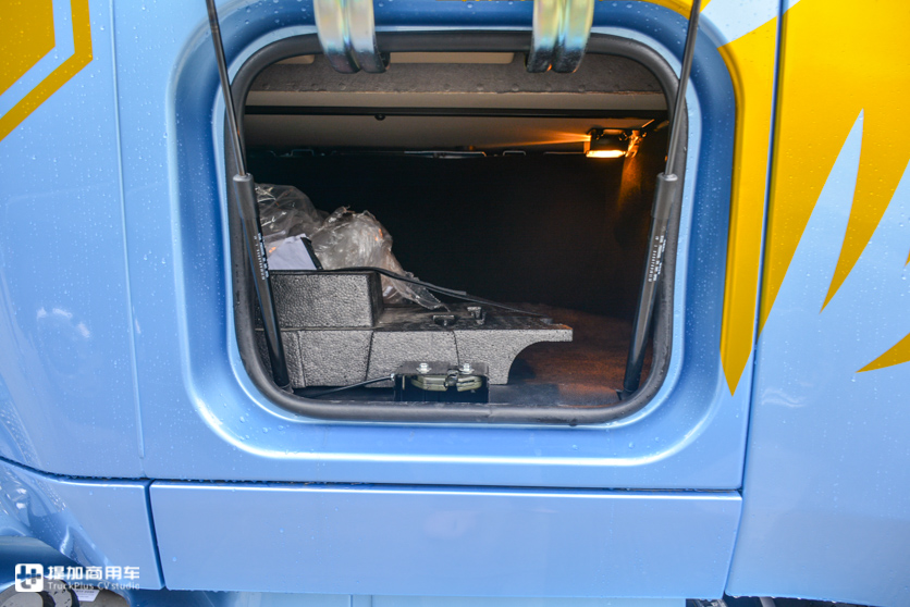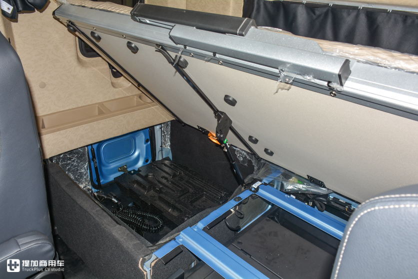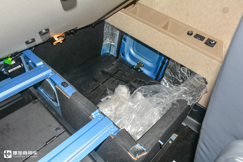 好在卧铺下的储物箱弥补回了一些空间。卧铺下的储物空间分三段,左右储物箱可与驾驶室外部连通,外部有箱门。