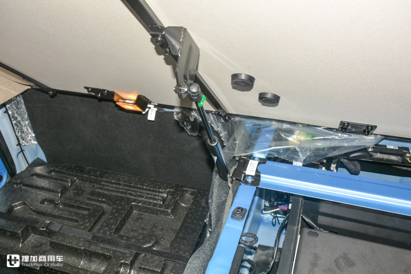 卧铺下的这一部分储物空间有两个值得表扬的优点和两个不足。先说优点吧,第一个卧铺下面有液压支撑杆,取放物品的时候不需要一只手扶着卧铺垫子,一只手艰难的拿东西了。