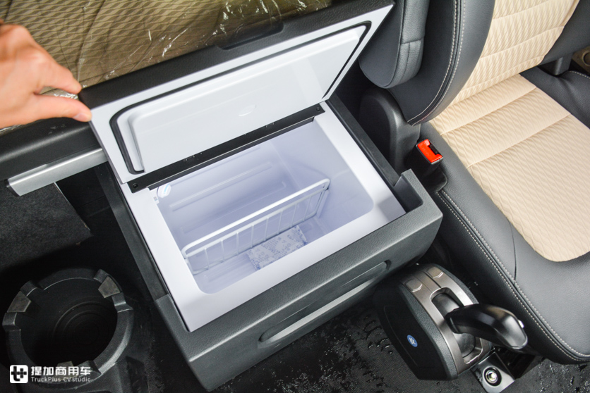 中间是车载冰箱,抽屉式设计,可以向外抽出。