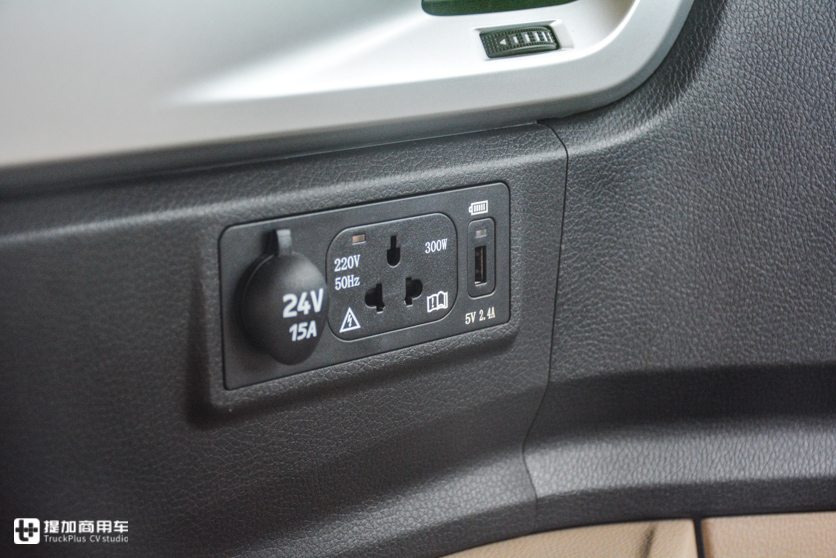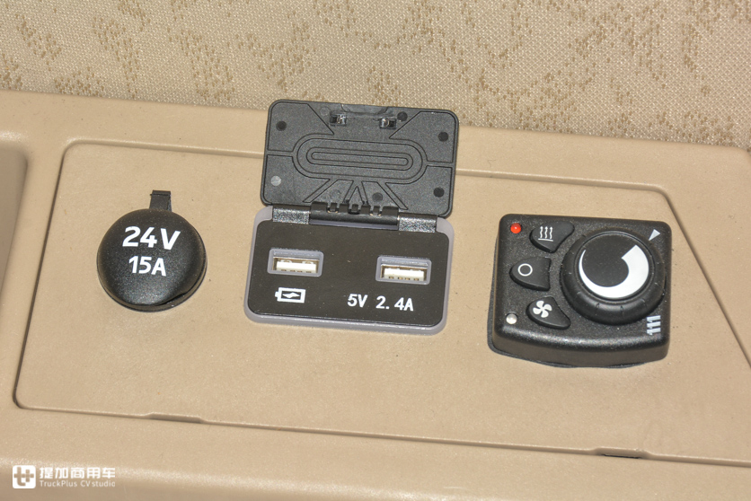 主驾驶座椅后是独立暖风出风口,控制开关在卧铺顶端。同样位置还有一个点烟器接口和两个USB充电接口,睡在床上也能方便的给手机充电。