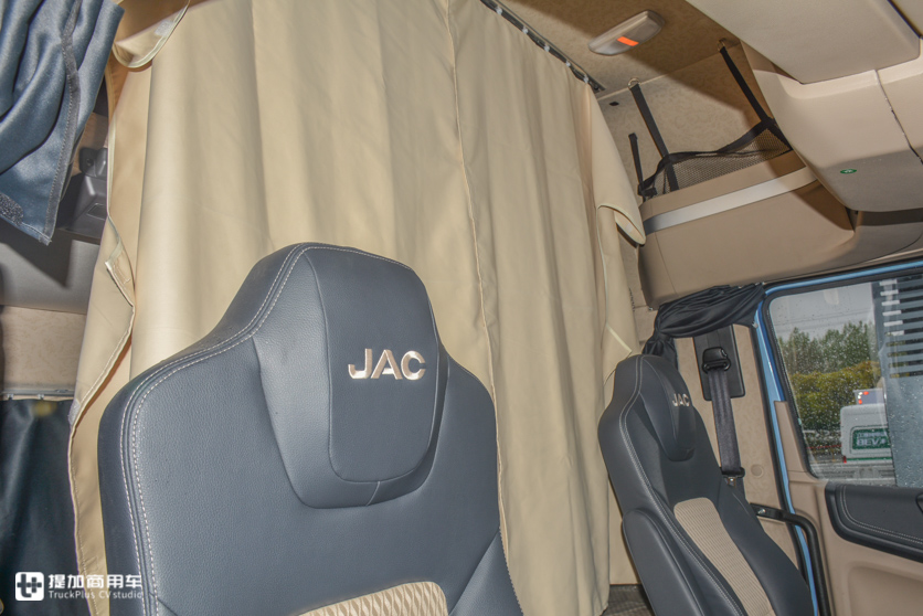 在卧铺尺寸已经比大部分平头车更宽的前提下,驾驶员还能有特别夸张的腿部空间。坐在座椅上,位置调到最后,腿往前几乎可以伸直,正常开车座椅大约调到中间位置就行了。受限于法规,原厂卧铺尺寸不能再做大了,但是座椅后部的空间有极大的富余,买回去之后自己可以利用这个空间改装一下,做个小柜子或者加宽卧铺都是不错的想法。