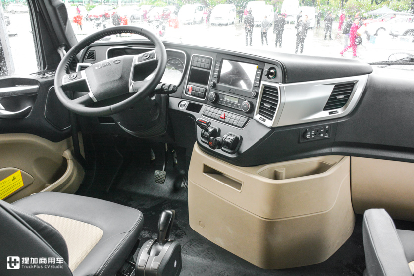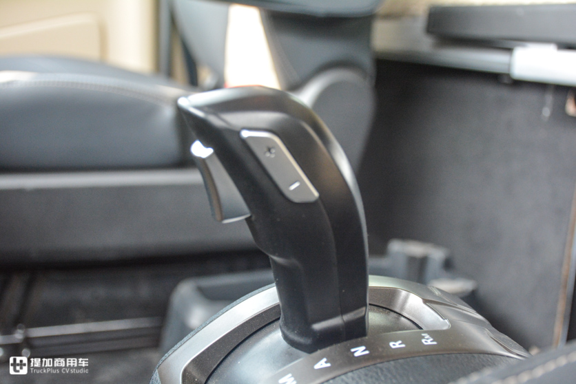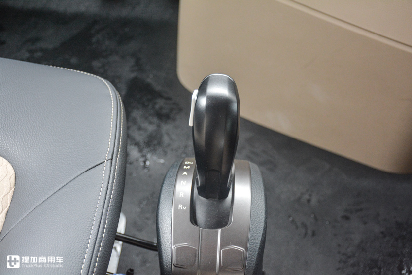 变速器不提供手动挡,目前只能配采埃孚最新一代TraXon手自一体变速器,12个前进挡,带液力缓速器。换挡杆安装在主驾驶座椅右侧,挡位布局和操作方式与乘用车类似,默认是在N挡位置,按住换挡杆前方的按钮才能挂挡。提供A(自动前进挡)、M(手动前进挡)、Dm(低速前进挡)、R(倒挡)、Rm(低速倒挡)模式,手动模式下按侧面的按钮手动加减档;Dm和Rm都是低速需要精准控制车辆前进或者后退时使用,类似离合器半联动效果。