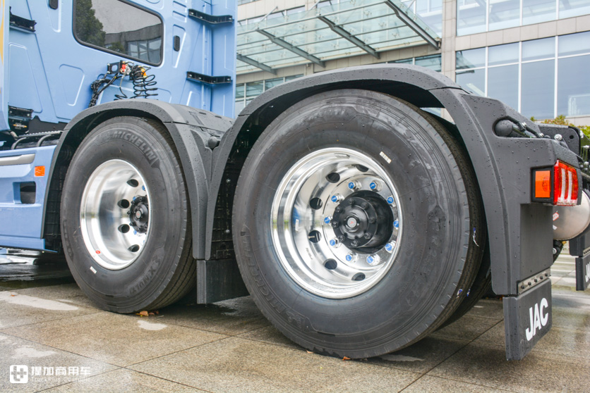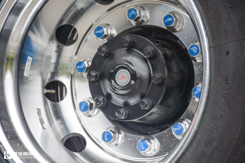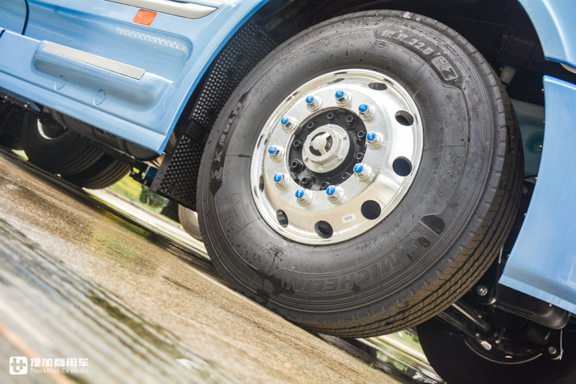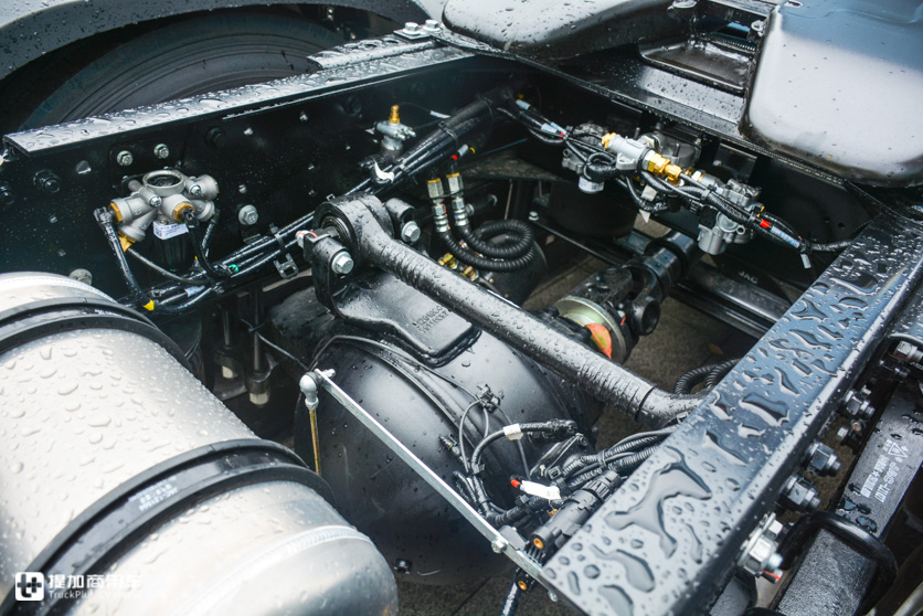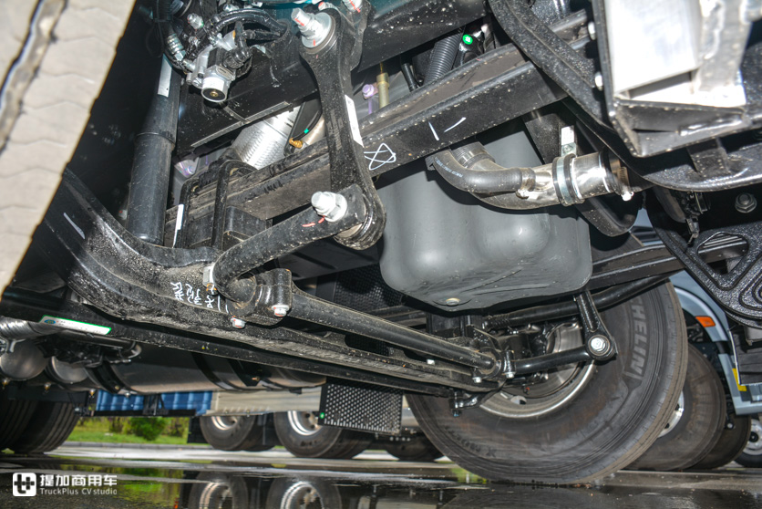 车桥方面,前桥用了康迈长维护轮端轴承,50万公里保养间隔周期,盘刹。