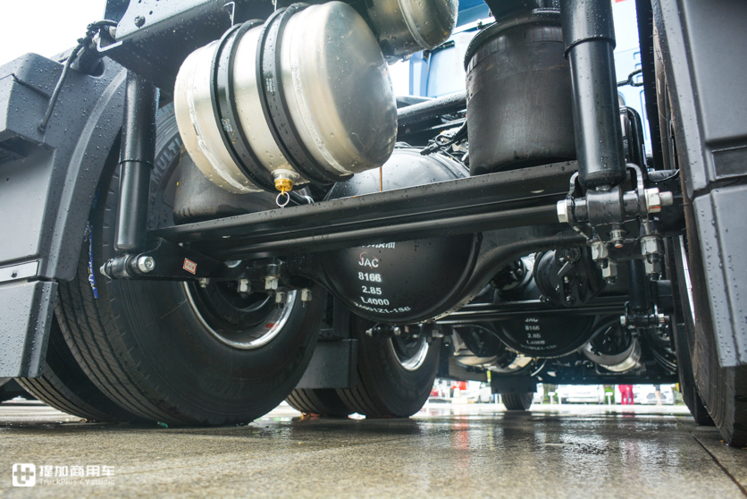 前悬架两片钢板弹簧,后悬架钢板拖曳臂式的气囊悬架,每轴2个气囊减震,美式风格,左右气囊有连接板。