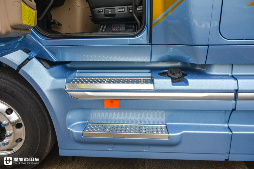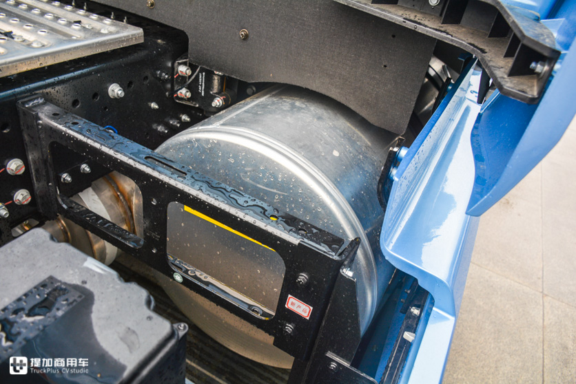 V7这底盘有趣的是油箱,侧裙板把油箱完全遮挡在内,仅留了加油口在外面,有一定的防盗作用。底盘左右两侧主、副双油箱搭配,总容量1000升,说它有趣是因为它用了圆形油箱,完全就是美国长头卡车的玩法,真是讲究。