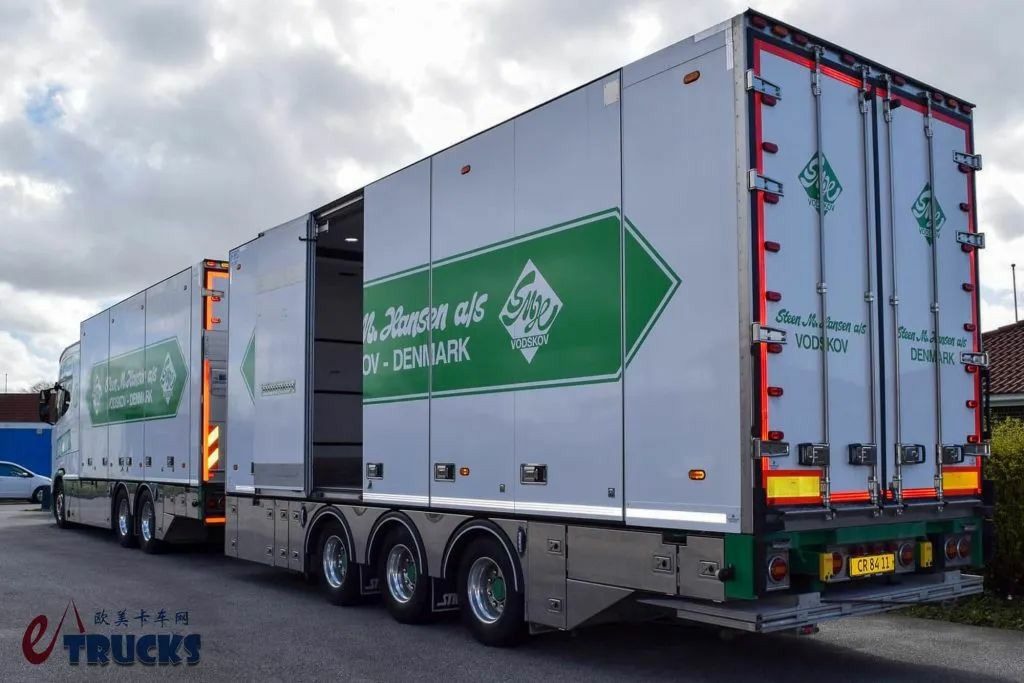 除了主车之外,这台斯堪尼亚770 S冷藏车还匹配了一台冷藏挂车。这台挂车也采用了底置冷机结构,并设计有众多储物箱、尾板等配置,设计语言也与主车保持了同步,相当的豪华。