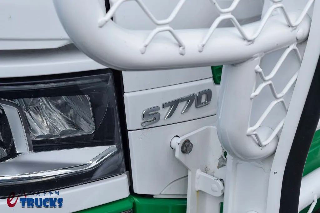 在牛栏下方,隐藏着车辆的型号标识:S 770。这并非官方型号,而是车辆在改装中做出的标识更改。这牵扯到一段有趣的故事:起初,斯堪尼亚S系的命名还是采用常规的型号+马力形式,例如730匹马力的S系车型名为S 730。不过:戴姆勒认为斯堪尼亚S系车型与奔驰旗下的S系轿车重名,因此双方达成协议、斯堪尼亚让步,将命名方式更改为了马力+型号。如今,斯堪尼亚全系车型都采用了这种新的命名方式,也算是重新做到了统一。