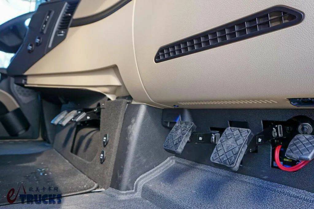 专业驾驶培训的目标更高:学员不仅要会开卡车,还要清楚的了解卡车的性能边界,比如加速刹车性能等等。正是因此,这台第二代奔驰Actros L在车内配备了三套踏板系统,前排三人每人都能分到一套踏板。除了主驾驶原本的油门刹车踏板外,另外两套踏板还新增了电子切换系统,也就是最右侧的小踏板,这个小踏板供教练使用,可在紧急情况下切断其他踏板对油门系统的操控,保障安全性。
