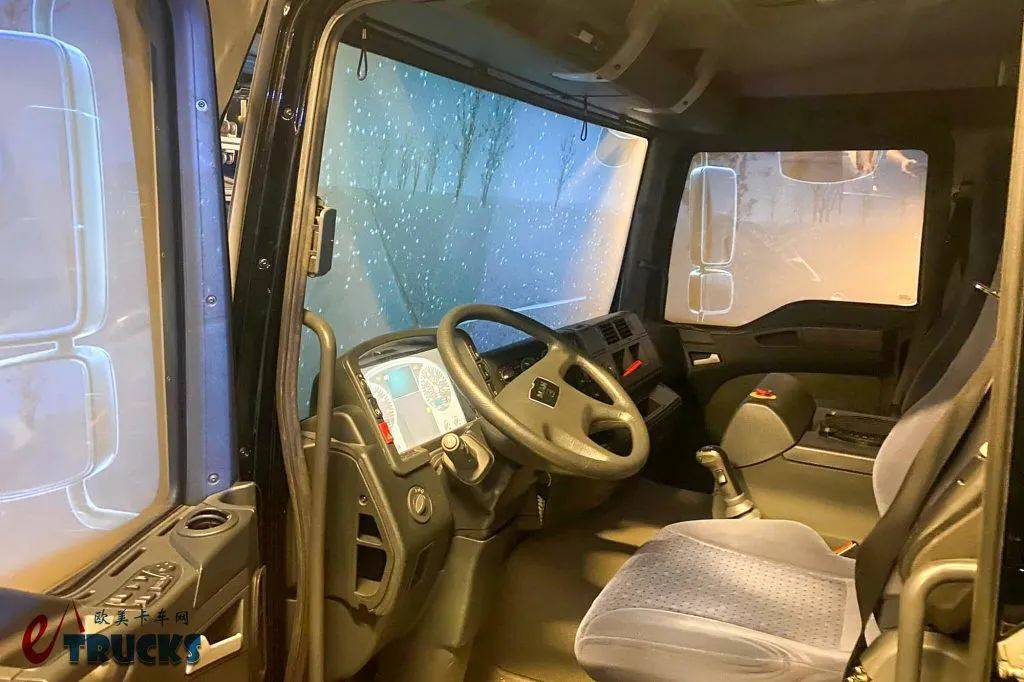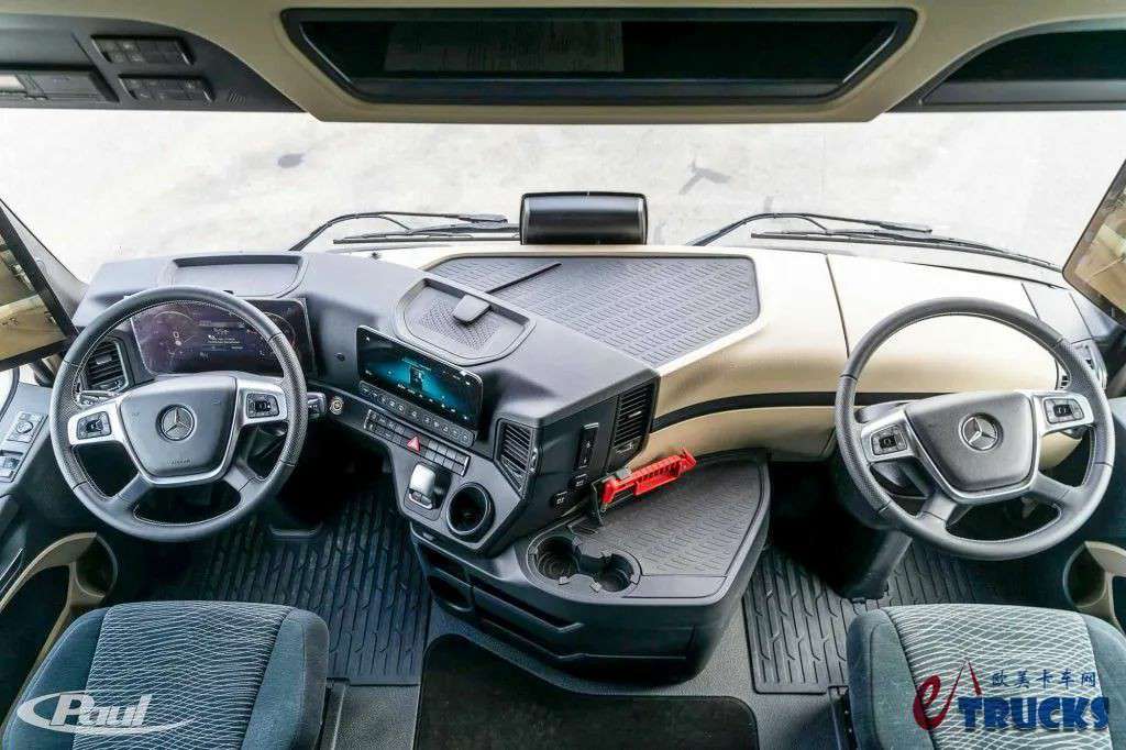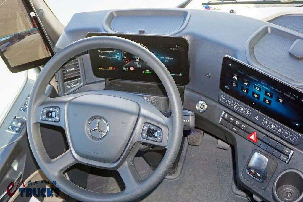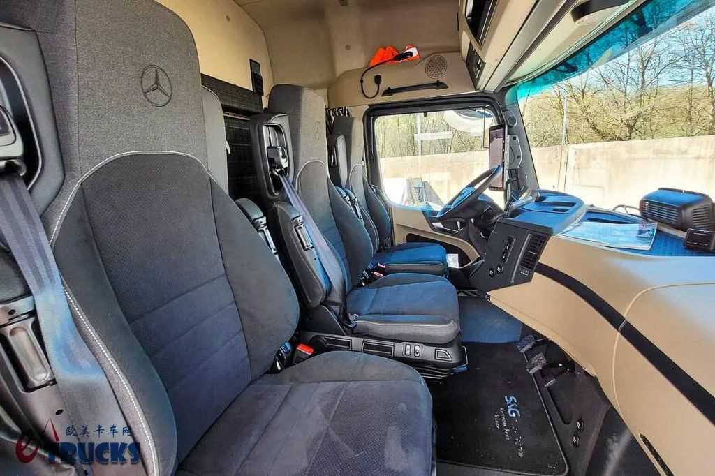 在内饰方面,第二代奔驰Actros L相比前代也没有太大的变化。车辆采用了全液晶仪表盘、触摸式多媒体屏幕,并搭载了第二代MirrorCam电子后视镜系统、电子手刹,甚至还选装了TSA挂车稳定性辅助系统。这套系统能通过电子系统自动施加制动、维持挂车行驶稳定,减少主挂折叠现象的产生。