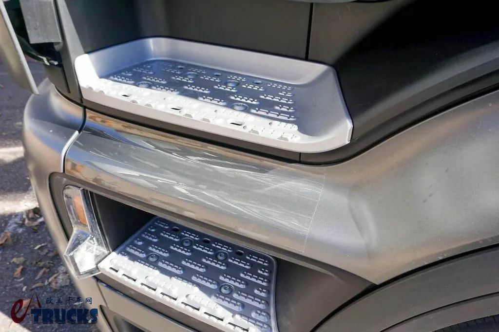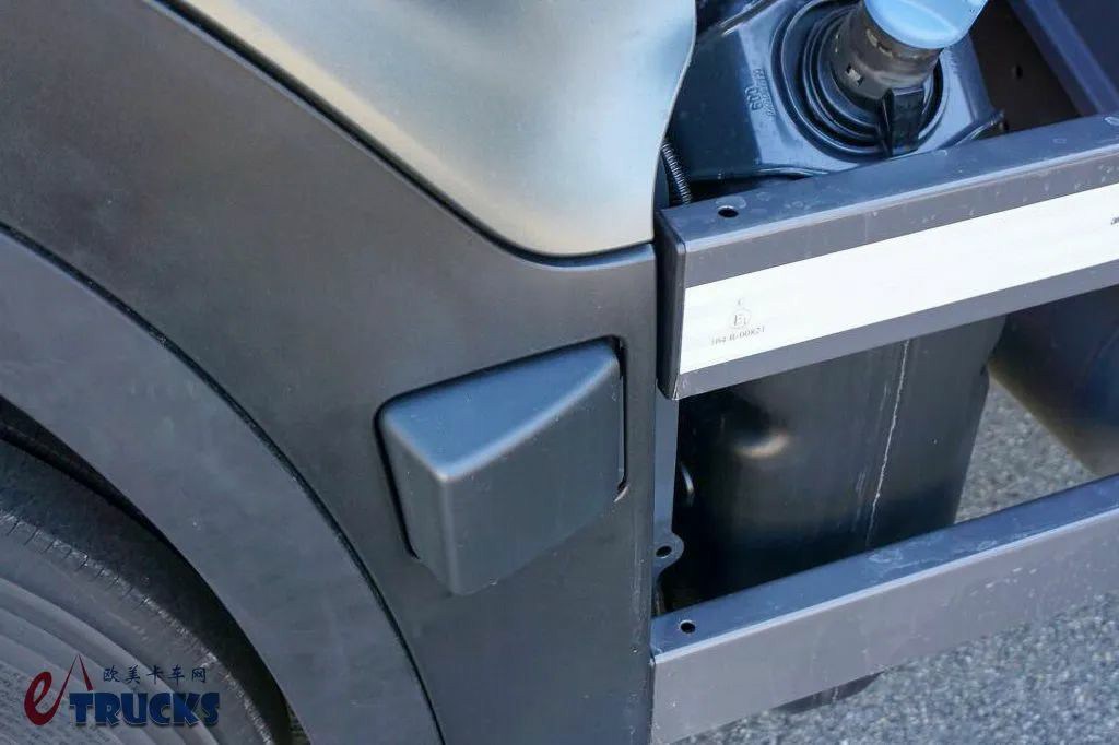 第二代奔驰Actros L车型的驾驶室采用了更加独立的“分离式”设计,保险杠、轮拱等车身下半部分结构直接与底盘相连,不再连接于驾驶室之上。这种设计能够降低驾驶室重量并改善重心分布,便于优化悬置减震系统,有助于提升行车舒适性。车辆第二级踏板固定在驾驶室上,第三级踏板则固定在底盘上。为了避免踏板间的底盘漆面受磕碰磨损,VA Hartmann在这贴了张透明膜,起到防撞缓冲效果。https://wxa.wxs.qq.com/tmpl/ll/base_tmpl.html