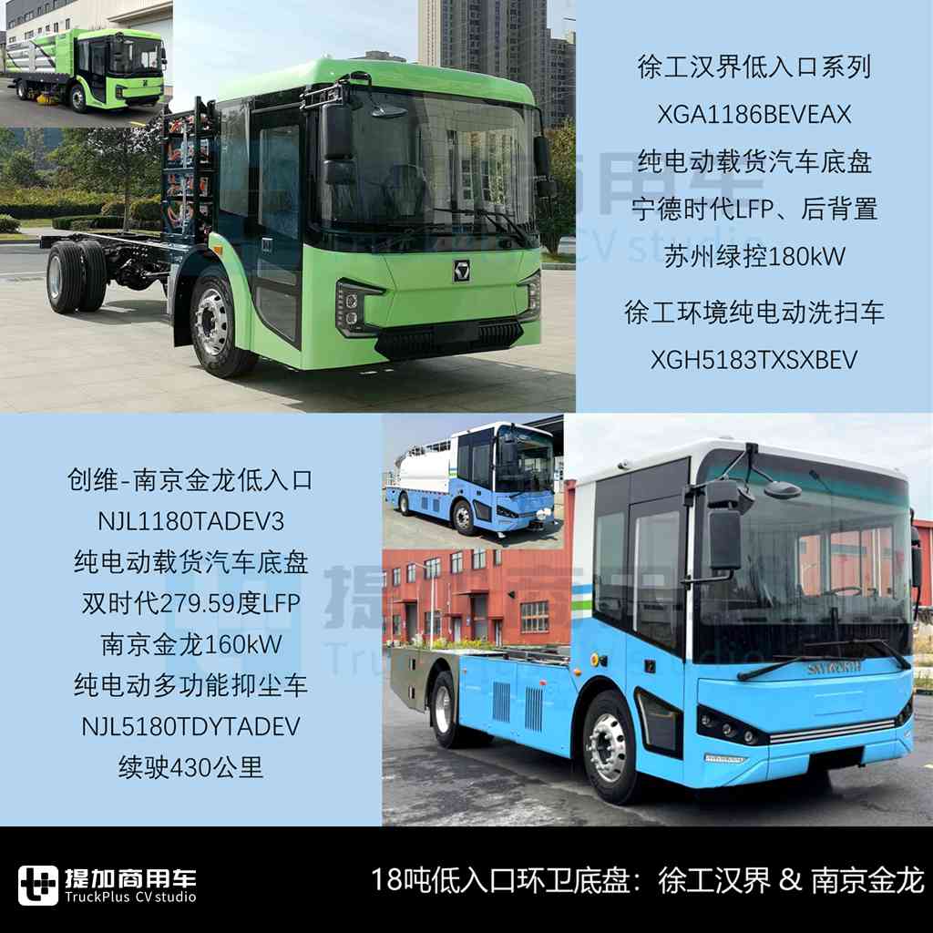 - 首款为徐工汽车汉界系列XGA1186BEVEAX纯电动载货汽车底盘,以及旗下徐工环境XGH5183TXSXBEV纯电动洗扫车。该新品利用徐工最新的“4米4轻卡”汉界系列驾驶室改制,车宽加大到2.5米、准乘3人,前/后轮距做加宽处理,由于采用前悬加长(2米)和驾驶室前移结构,有效降低座椅高度、改善观察视野,同时右侧外摆门增加下部观察窗。该底盘轴距4.7米,可选八组板簧悬挂,搭载宁德时代LFP动力电池、驾驶室后背置方案,苏州绿控180kW驱动系统,形成整车后全长9270mm,额载4545kg,此品类也是市政环卫最常用的车型之一。