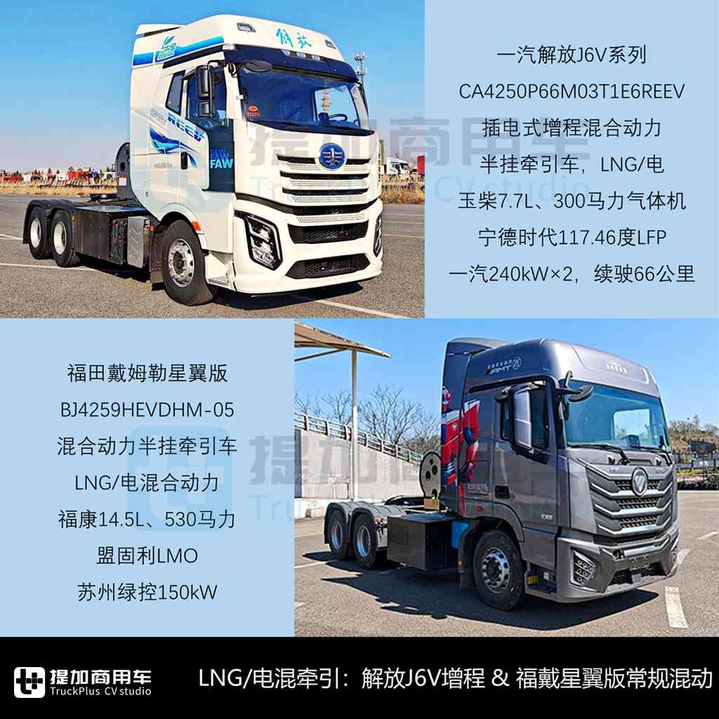 - 今年2月期公示,重汽成都申报了行业首款采用LNG/电混方案的豪沃V7-X系列ZZ4252V3847Z1SHEV插电式增程混合动力牵引汽车(宁德时代58.73度LFP动力电池),本批其申报了采用潍柴弗迪单体、潍柴成组LFP动力电池的ZZ4257V3847Z1SHEV,进一步丰富可选配置。同时一汽也进入该领域,申报了解放J6V系列CA4250P66M03T1E6REEV插电式增程混合动力半挂牵引车,准乘2人,轴距4米,前/后2片板簧悬挂,准拖37.87吨挂车,LNG气瓶驾驶室后背置方案,匹配玉柴7.7L、300马力气体机,搭载宁德时代117.46度LFP动力电池、轴间底置方案,一汽240kW×2驱动系统,纯电续驶66公里,气耗53.8kg/100km。在乘用车圈爆火的REEV,在商用车业目前仍属少数派,此前可见的个别车型多为吉利远程系的醇电增程方案,而柴电、气电增程则依然有较大探索空间。
