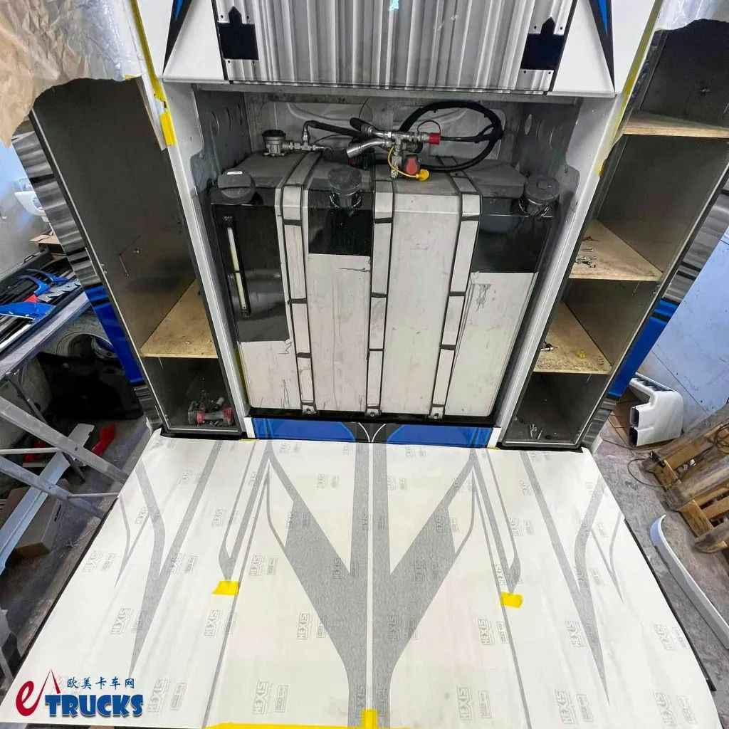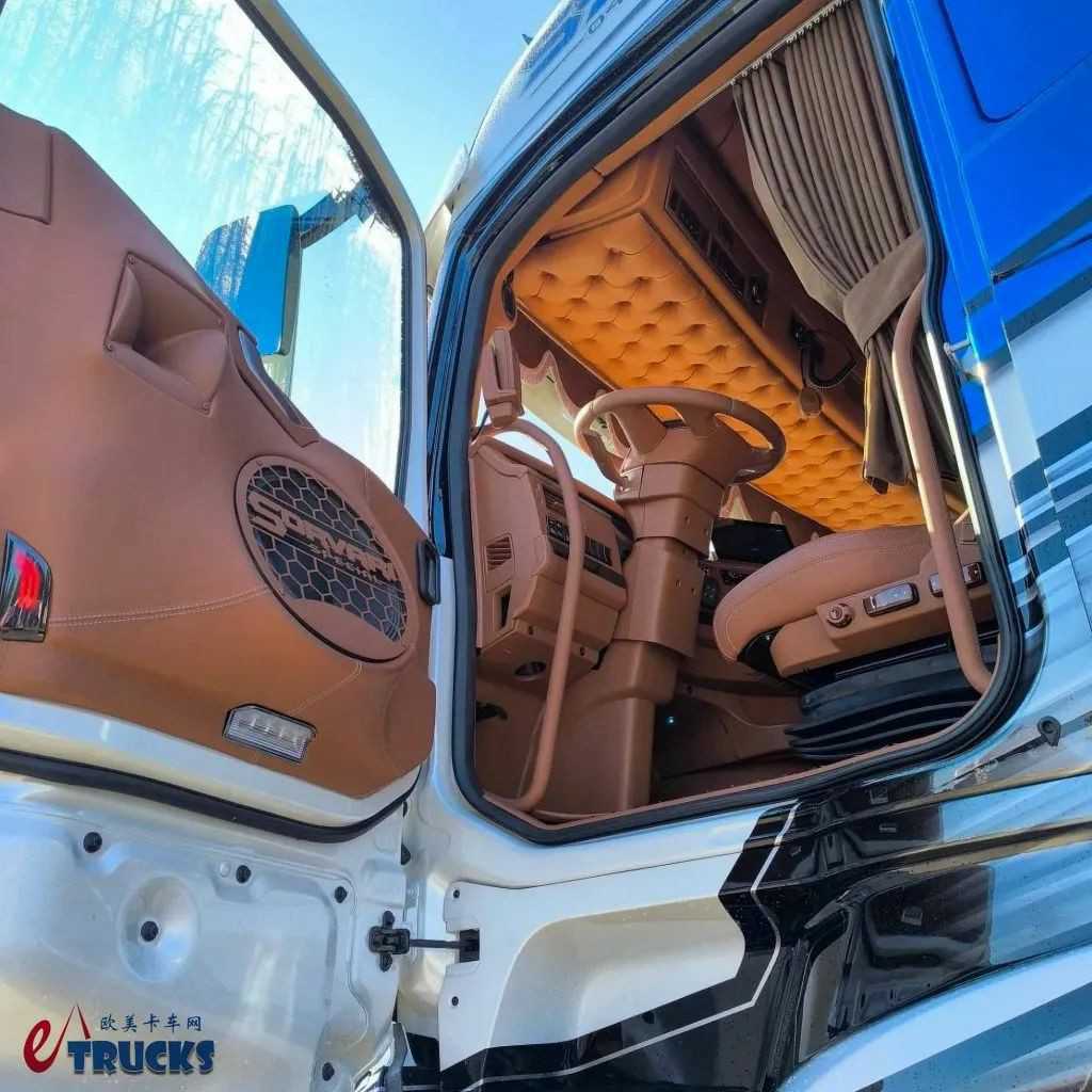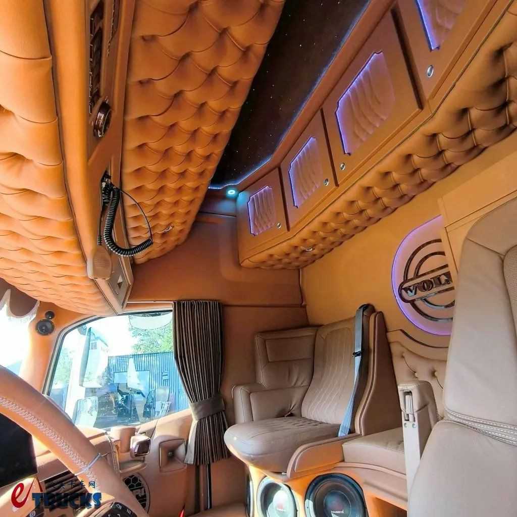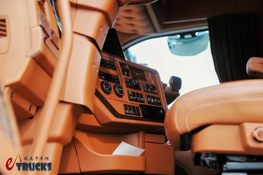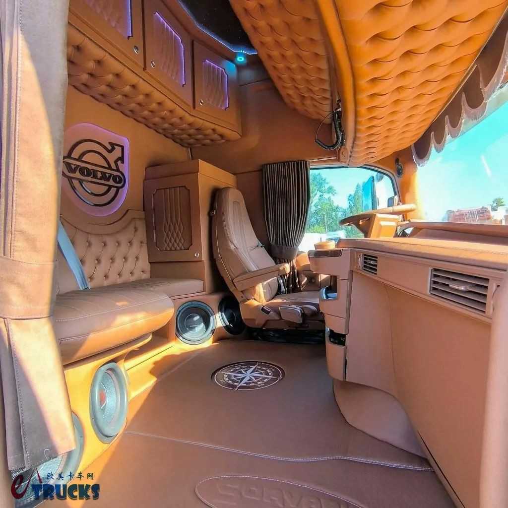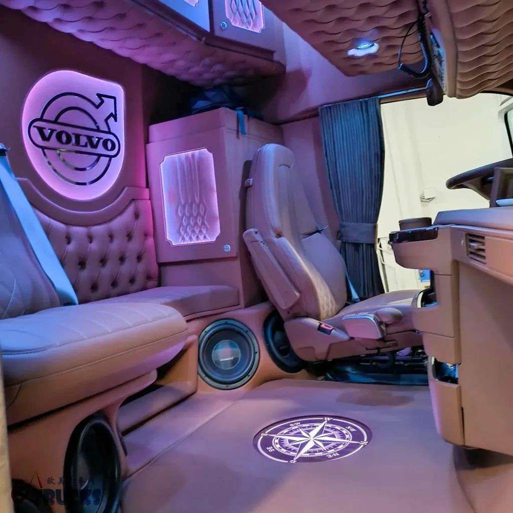 基于沃尔沃Globetrotter XL驾驶室的宽敞空间,本车内饰也进行了彻底的爆改。接下来,就让我们进入车内来体验一下。