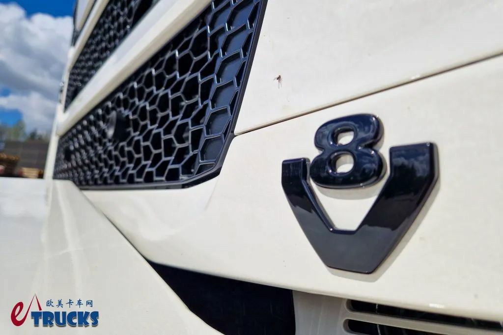 黑化V8标识闪耀在前面罩右下角,代表这是一台搭载了V8发动机的高端车型。本车采用的便是斯堪尼亚新一代V8发动机中的DC 16 122型号,排量16.4升,输出660匹马力及3300牛米扭矩,匹配斯堪尼亚新一代OptiCruise G33CM变速箱。在当今的欧洲卡车行业中,斯堪尼亚是唯一一家能够提供V8发动机的企业,是极为孤傲的存在。