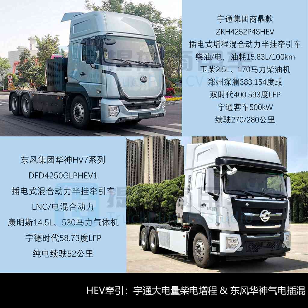 - 宇通集团本批申报了大电量款的ZKH4252P4SHEV插电式增程混合动力半挂牵引车,采用商鼎款驾驶室、准乘2人,柴电增程混动方案,轴距3.9米,可选12组板簧悬挂,准拖38.87/38.57/38.17吨挂车,匹配玉柴2.5L、170马力柴油机,搭载郑州深澜383.154度或双时代400.593度LFP动力电池、轴间两侧底置+驾驶室半背置方案,宇通客车500kW驱动系统,油耗15.83L/100km,纯电续驶270/280公里,在同类车型中是绝对意义的最大电量车型。对增程类牵引车而言,行业目前共有18款可售车型,包括十款醇电增程、气电增程六款(CNG两款+LNG四款)以及柴电增程两款,其中还有两款采用换电式技术路线,吉利华菱的远程星瀚G系HN4250X44C9SHEVY插电式增程混合动力换电式牵引汽车曾以宁德时代344.24度LFP动力电池+纯电续驶320公里一度领先。而宇通集团本批新品的出现也刷新了同类车型搭载电量的新高,从而与绝大多数的60-140度级别形成有效区隔,应被视为是对增程技术路线的一次有趣探索。