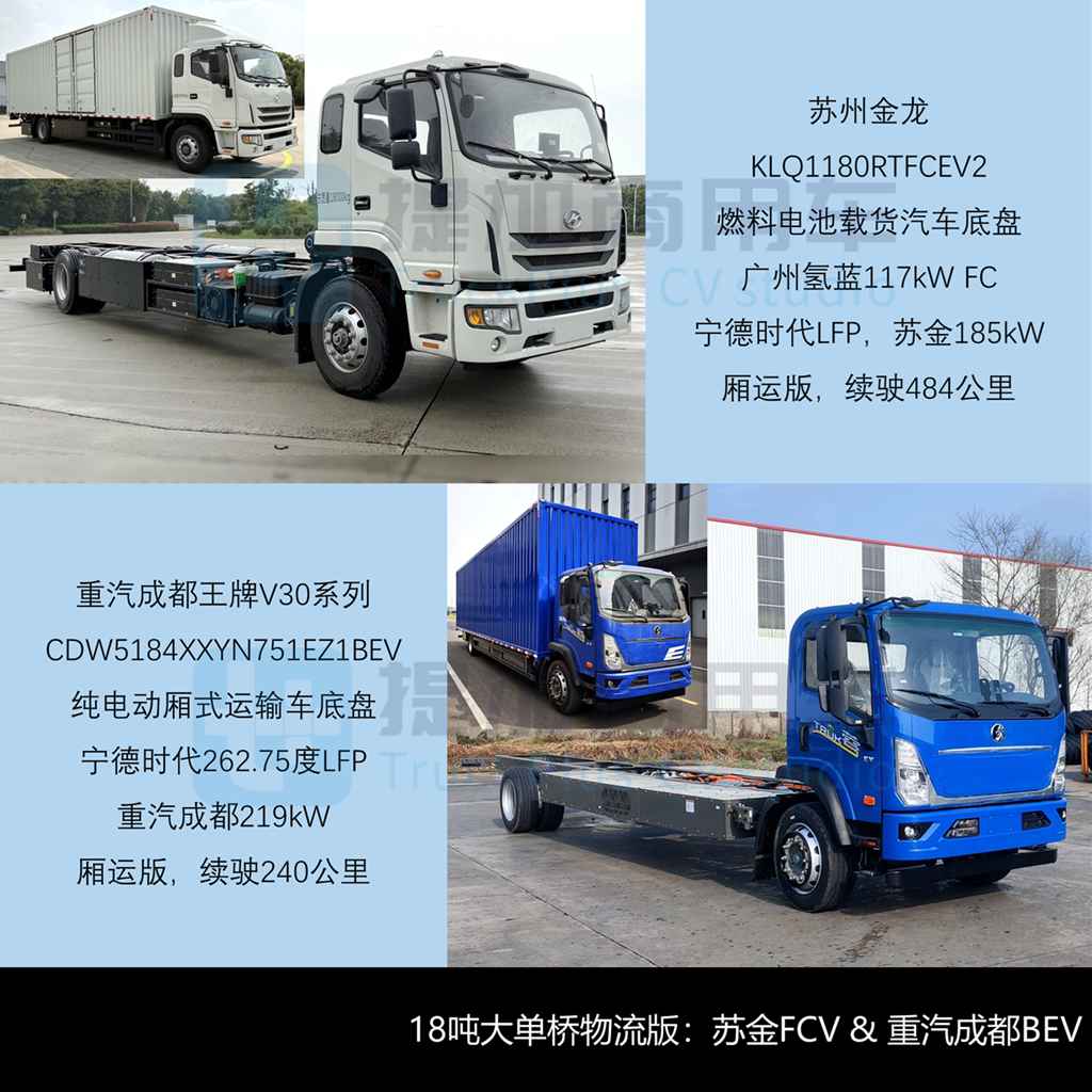 宇通大电量柴电增程、东风气电混动,18吨载货:苏金FCV、重汽成都BEV大中卡