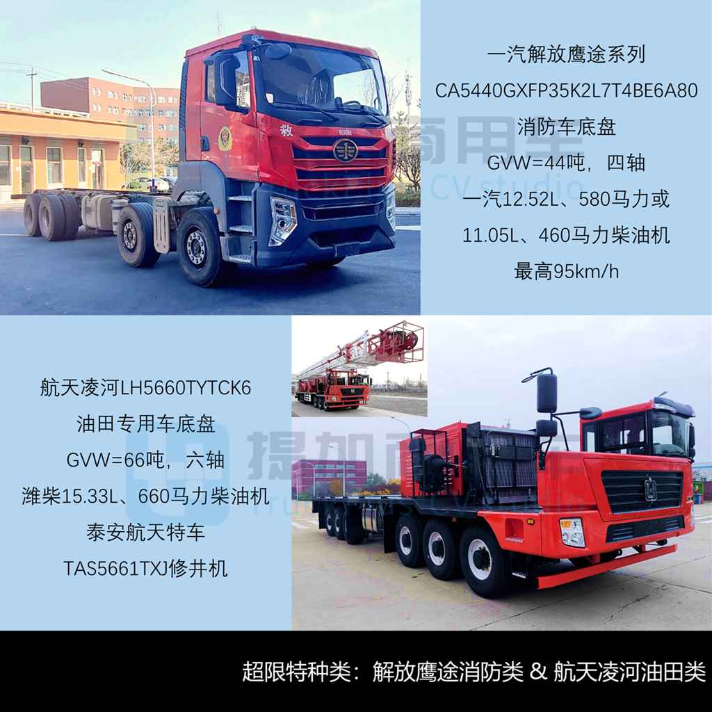 东风系越野款、锦程KH平板小三轴,解放鹰途44吨消防类、航天系整合油田类