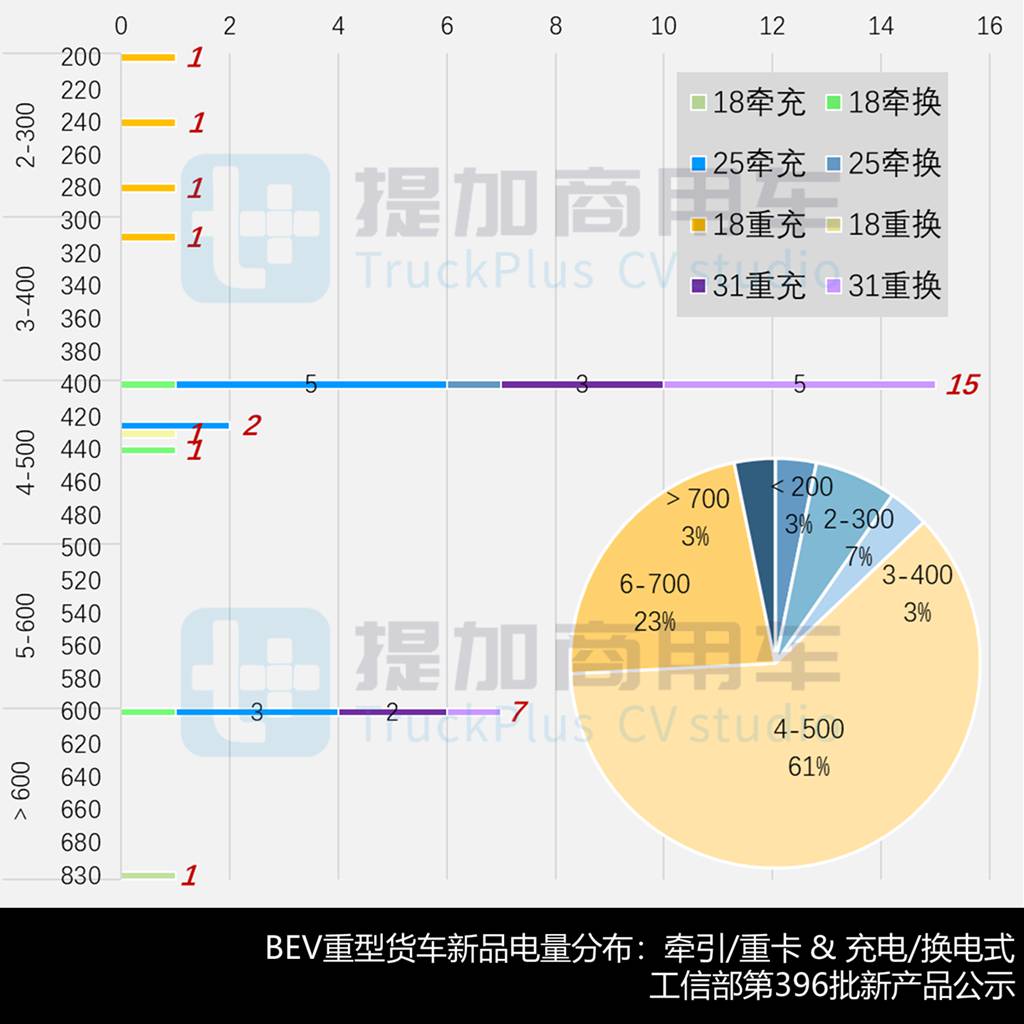 对本月期所有的BEV重型货车新品进行全范围的电量统计,虽然新品数量达到60款、且NEV渗透率创下历史新高,但仍有大量系列化申报的新品未进行免税目录同期申报,故电量可查的新品仅有27款、折合31组方案,以下进行讨论。
