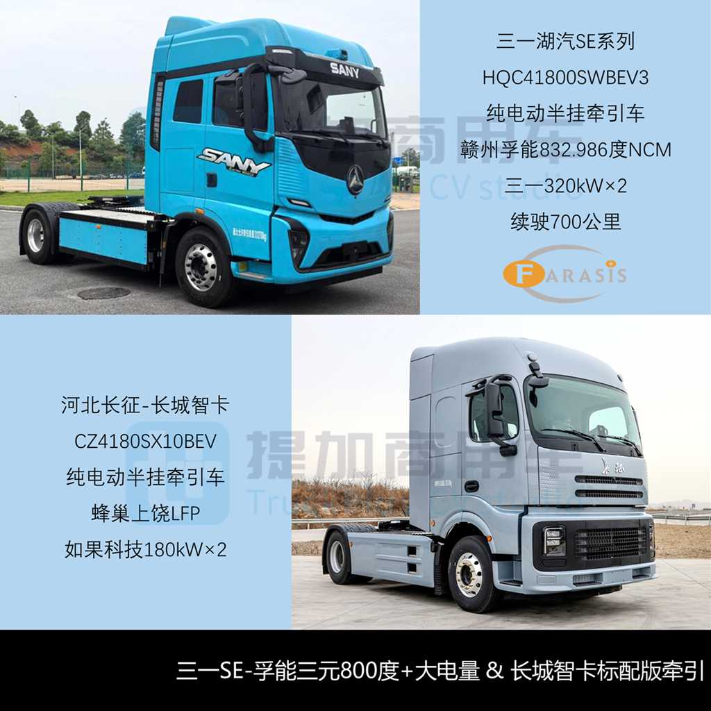 - 河北长征本批对长城智卡进行标配化扩展,申报了CZ4180SX10BEV纯电动半挂牵引车,相较前期CZ4180SS10BEV的主要变化是后悬增选了3+3片板簧悬挂,整备质量做对应调整,准拖挂车扩展了32.12/32.02吨两组规格,搭载蜂巢上饶/无锡单体、蜂巢上饶成组LFP动力电池,如果科技180kW×2驱动系统,对比前款采用573.97度LFP动力电池方案推算,本批新品的基础电量应该不变。6月25日,长城智卡在河北保定举行发布会,宣布混动G1050旗舰车型起售价53.66万元;除了高调亮相的Hi4-G混动架构外,采用BEV技术的牵引车型也是长城智卡的另一增长极,同样值得各界关注。