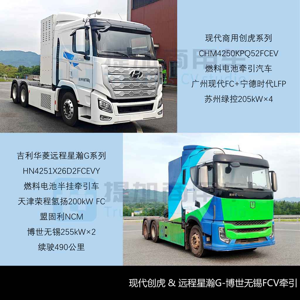 - 现代商用车本批申报了创虎Xcient系列CHM4250KPQ52FCEV燃料电池牵引汽车,也是其首款FCV牵引车型。该新品准乘2人,轴距3.9米,前2片、后3片板簧悬挂,准拖37.66吨挂车,搭载广州现代氢能100kW×2燃料电池+宁德时代LFP动力电池,苏州绿控205kW×4两根双电机电驱桥。现代商用车曾在4月期公示申报了32吨FCV环卫版底盘,并由旗下广州现代汽车改制为厢式垃圾车。在全球氢能汽车领域,来自韩国的现代汽车也是一支重要势力,从燃料电池系统到各类型整车产品都有布局,而2025年的国内FCV市场也出现了此类国际品牌的身影而不容小觑。
