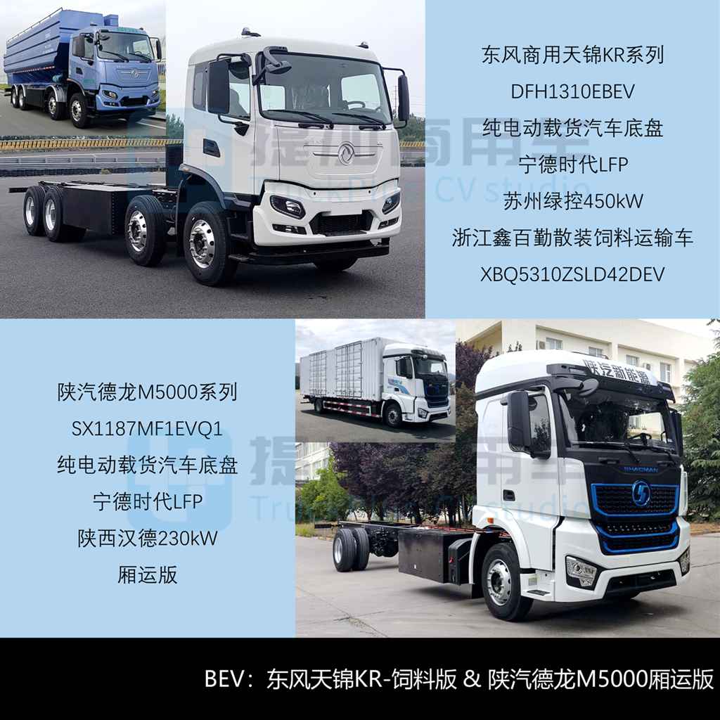 - 陕重汽今年推出德龙M5000系列新品,定位于农副、冷链、快递载货的中高端产品,本批进行电动化扩展,申报了SX1187MF1EVQ1纯电动载货汽车底盘,以及厢运版整车。该新品采用德龙系前大灯、可选飞翼晶钻大灯,准乘2人,轴距5/5.7/7.2米,前3片、后3+3片板簧悬挂,搭载宁德时代LFP动力电池、轴间两侧底置方案,陕西汉德230kW驱动系统,形成整车后全长9.15-12米五组规格,箱长6.9-9.75米四组规格、额载8.07/7.37吨,公告注明“可采用上装委托加装方式生产”。