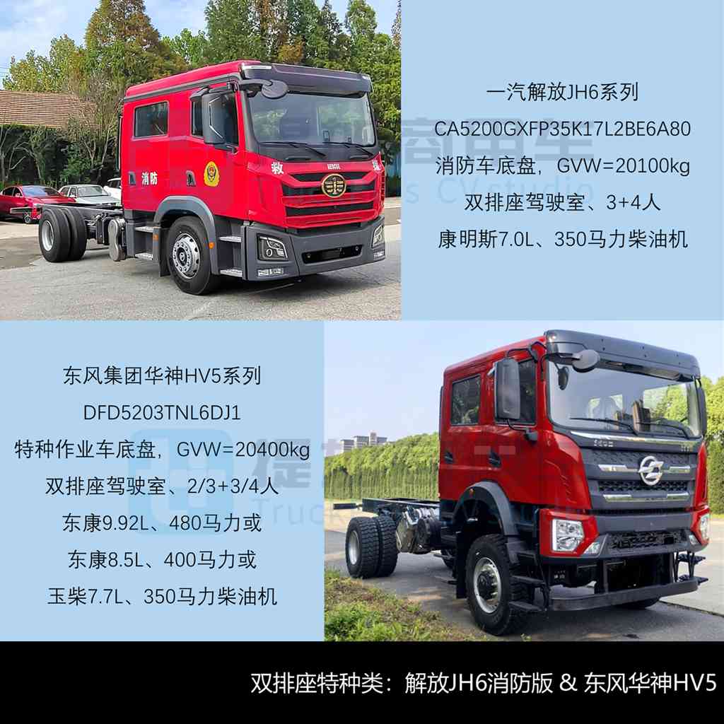 - 首款为一汽申报的CA5200GXFP35K17L2BE6A80消防车底盘,采用解放JH6系列双排座驾驶室、准乘3+4人,后排尺寸加大以适应队员乘坐需求。该新品GVW=20100kg,车宽2540mm,轴距4.6米,前3片、后3+3片板簧悬挂,匹配康明斯7.0L、350马力柴油机,最高110km/h。作为极其重要的应急保障车辆,消防类车辆的双排座驾驶室相对常见,而单排座的底盘也多会在驾驶室后方增设单独的乘员室,以适应驾乘人员不超过12人的国标上限要求。2025年的一汽解放连续两月期申报了消防类底盘新品,正通过提供多种规格的解决方案,强化在该领域的地位。