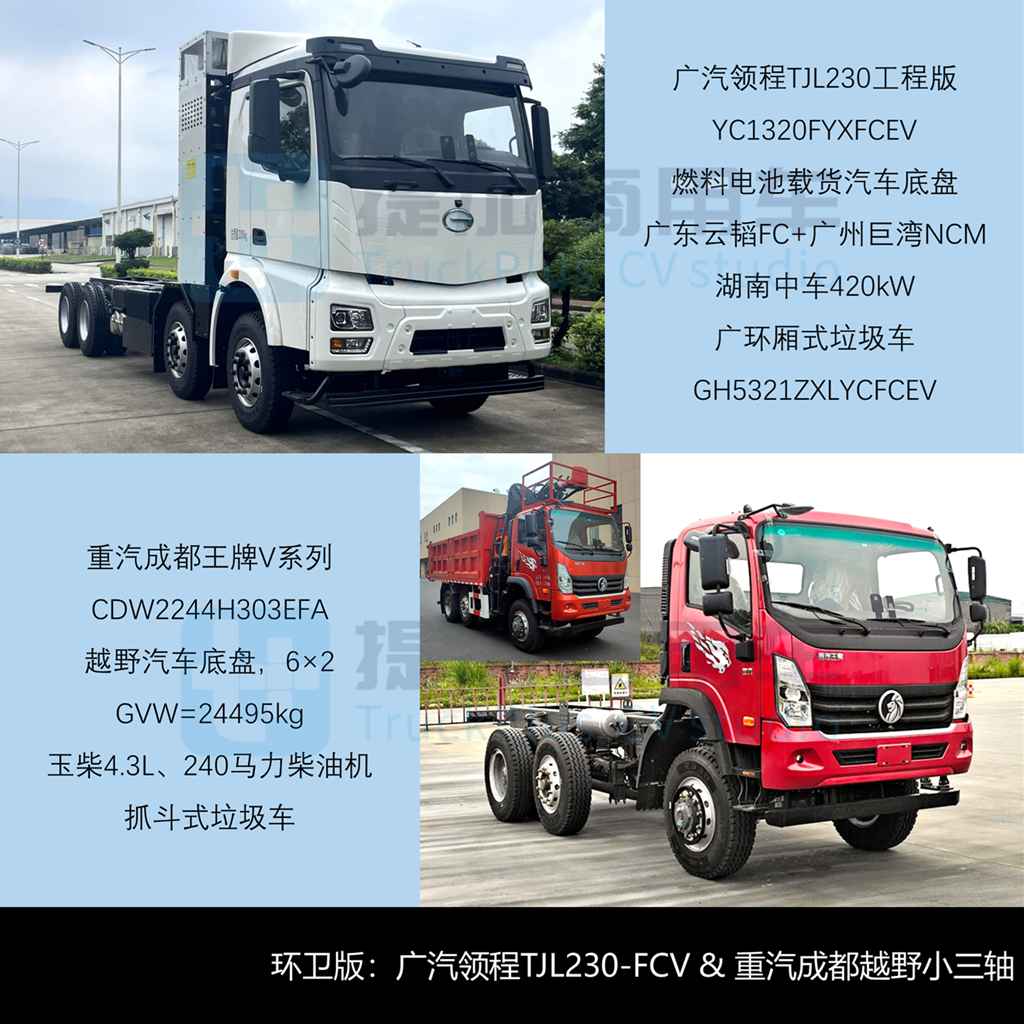 - 更名后的广汽领程也开始介入新能源环卫领域,本批携手同处广州的广环机械,申报了YC1320FYXFCEV燃料电池载货汽车底盘,以及GH5321ZXLYCFCEV厢式垃圾车。该新品采用广汽TJL230工程版驾驶室,车宽2525mm、准乘2人,GVW=32吨,轴距4050mm,双前3/9片板簧、后空气悬挂,搭载广东云韬氢能燃料电池+广州巨湾技研NCM动力电池,中车电驱420kW驱动系统,形成整车后全长10.98米、箱长6.8米、额载15.31吨,采用推铲后卸式方式。目前广东云韬氢能也是广汽领程在氢能领域的重点合作伙伴。