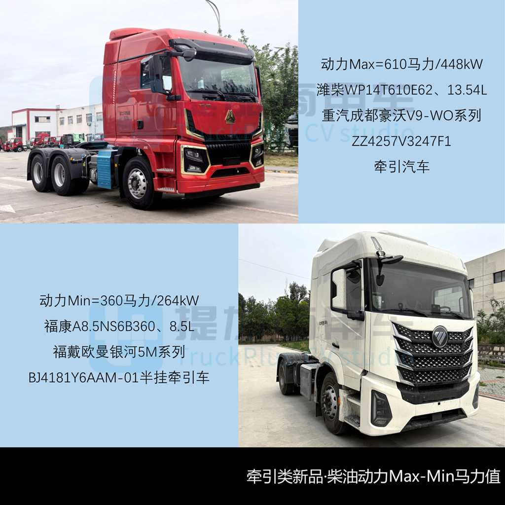 牵引类柴油动力Max=610马力/448kW,即潍柴13.54L的WP14T610E62柴油机,由重汽成都ZZ4257V3247F1牵引汽车采用,全新一代豪沃V9-沃系列驾驶室,基础车宽2496mm、准乘2人,可选豪沃V7-X经典造型,主体参数规格丰富:可选3200-3425mm五组轴距和九组板簧悬挂,准拖40/39.27吨挂车,同时可选重汽13.02L、510马力方案,油耗均为39.0L/100km。作为采用古蜀文化造型语言、极具地方人文特色的车型,重汽V9-沃在年初上市、并率先介入LNG牵引领域,本批也及时扩展大马力柴油版,体现出在2025年优先发展的主力产品定位。
