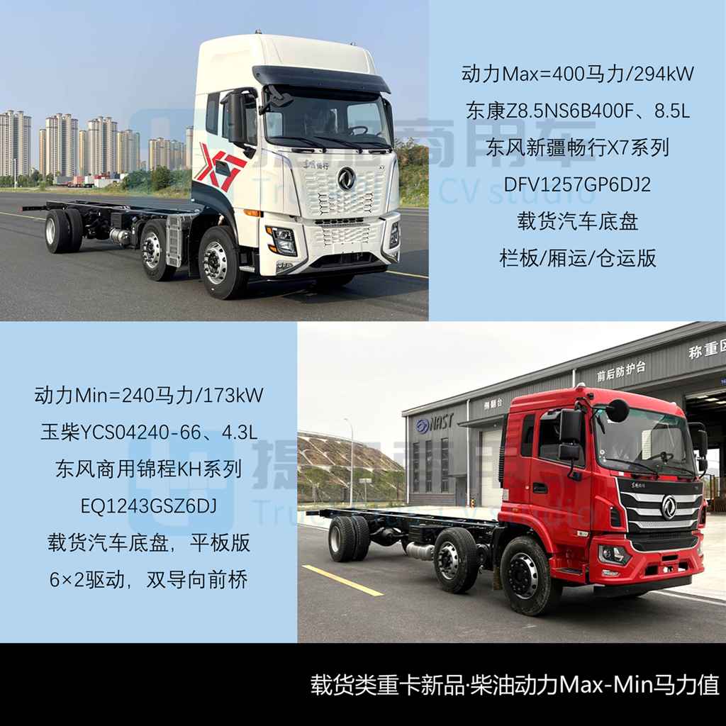 载货类柴油动力Max=400马力/294kW,即东风康明斯8.5L的Z8.5NS6B400F柴油机,由东风新疆FV1257GP6DJ2载货汽车底盘,以及栏板/厢运/仓运版整车采用,畅行X7系列驾驶室、准乘2/3人,也是业内较早配装“晶钻飞翼款”前大灯的车企之一,同时可选畅行X3系列造型,6×2小三轴驱动、双导向前桥,轴距4.1/5.25米,可选五组板簧悬挂,以厢运版为例,形成整车后全长10.15/10.25/12米,箱长7.7-9.6米五组规格,额载14.47/14.4吨、载质量利用系数1.40,油耗29.5L/100km。